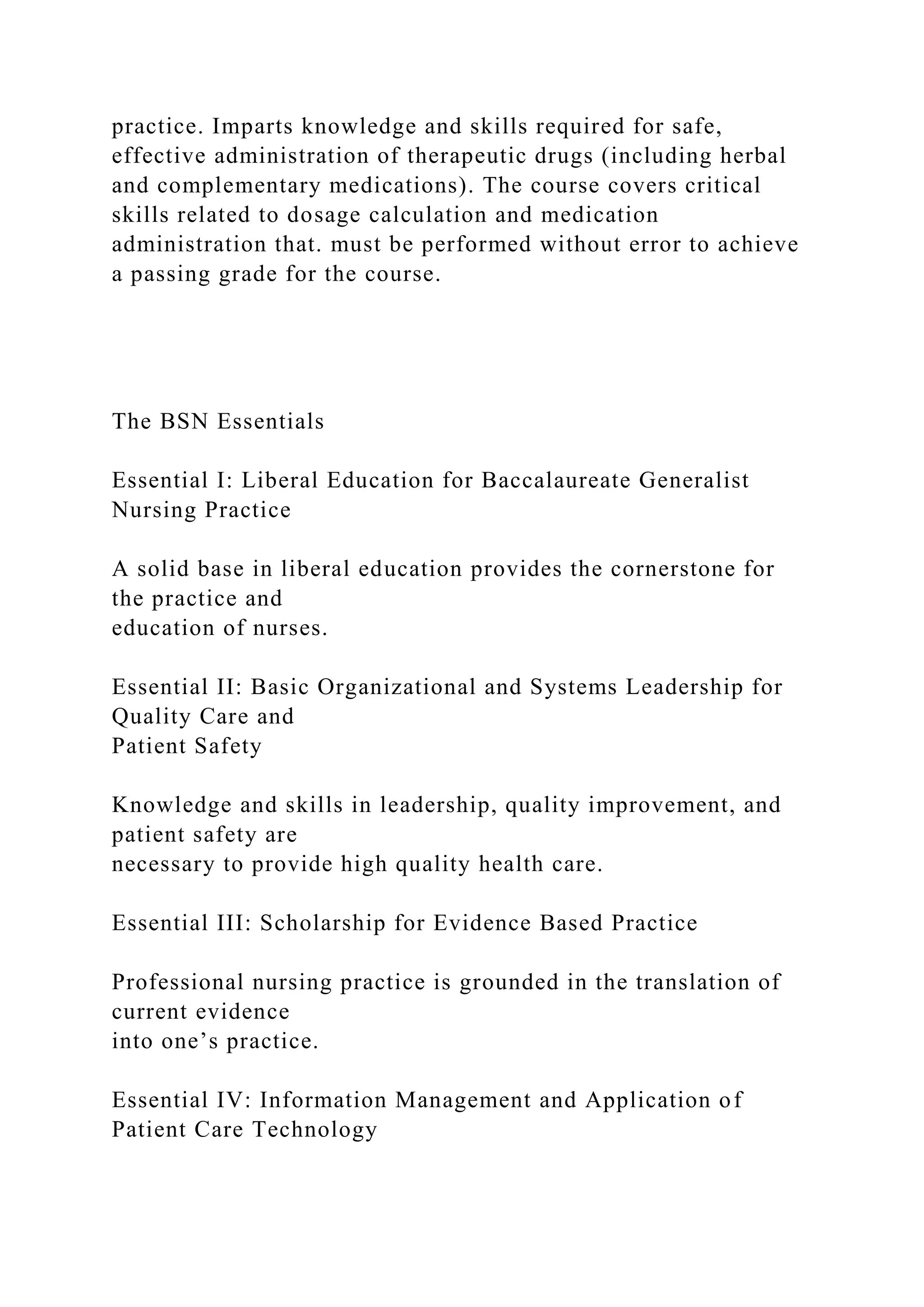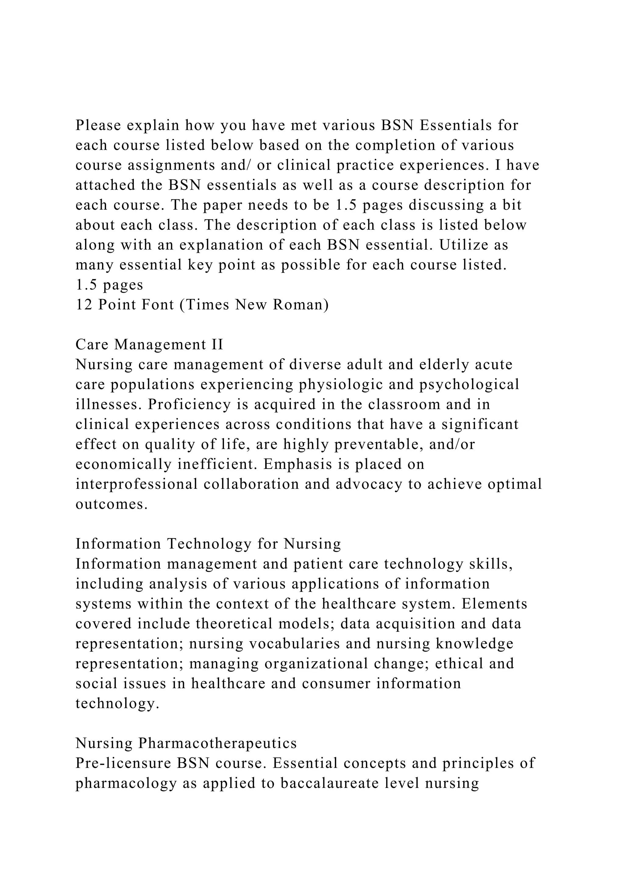 The document outlines the requirements for a paper discussing how various BSN essentials have been met through course assignments and clinical practice experiences in nursing education. It lists key courses like Care Management II, Information Technology for Nursing, and Nursing Pharmacotherapeutics, detailing their focus on patient care, interprofessional collaboration, and essential nursing skills. The paper is expected to synthesize course content with the BSN essentials while adhering to specified formatting requirements.