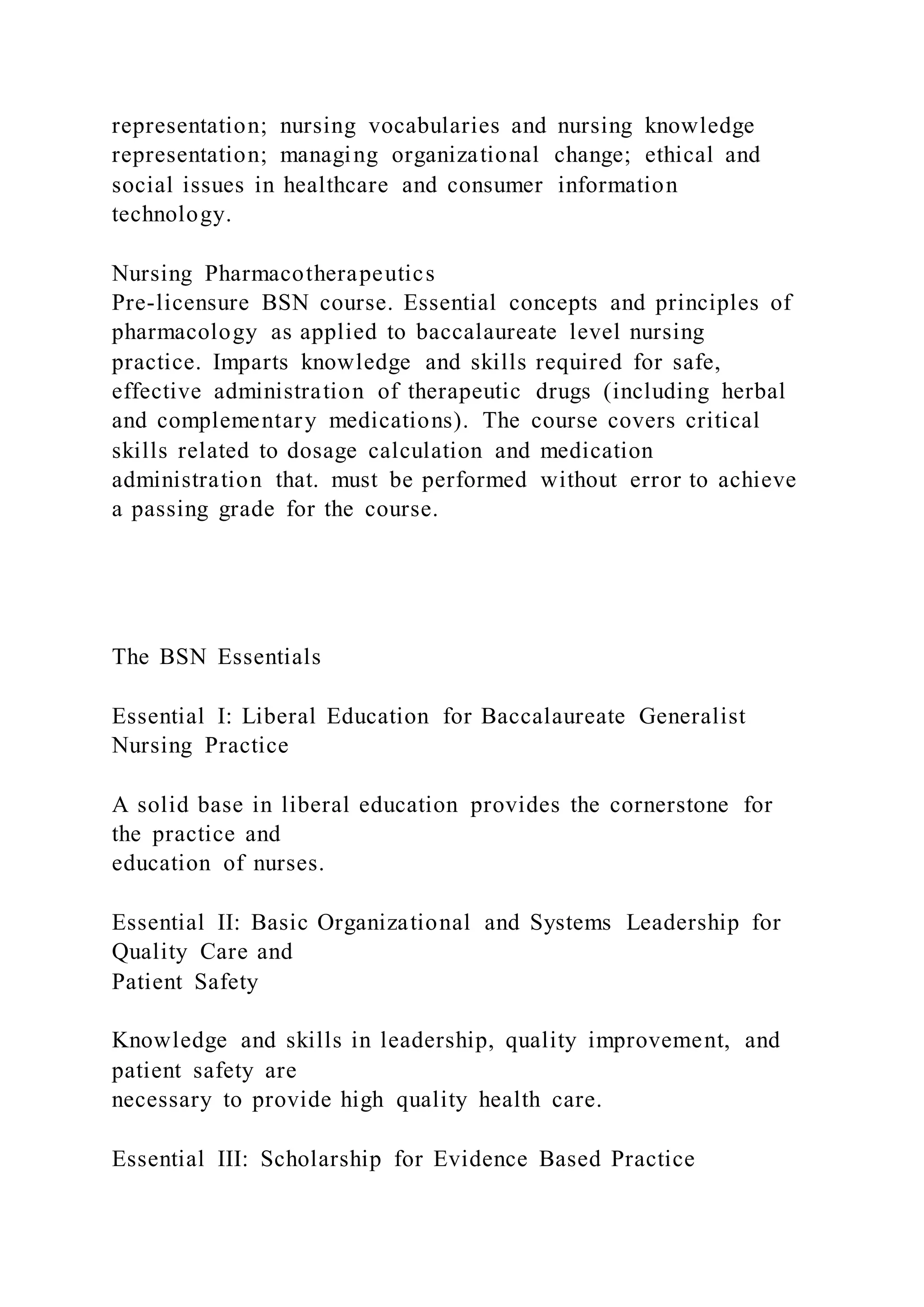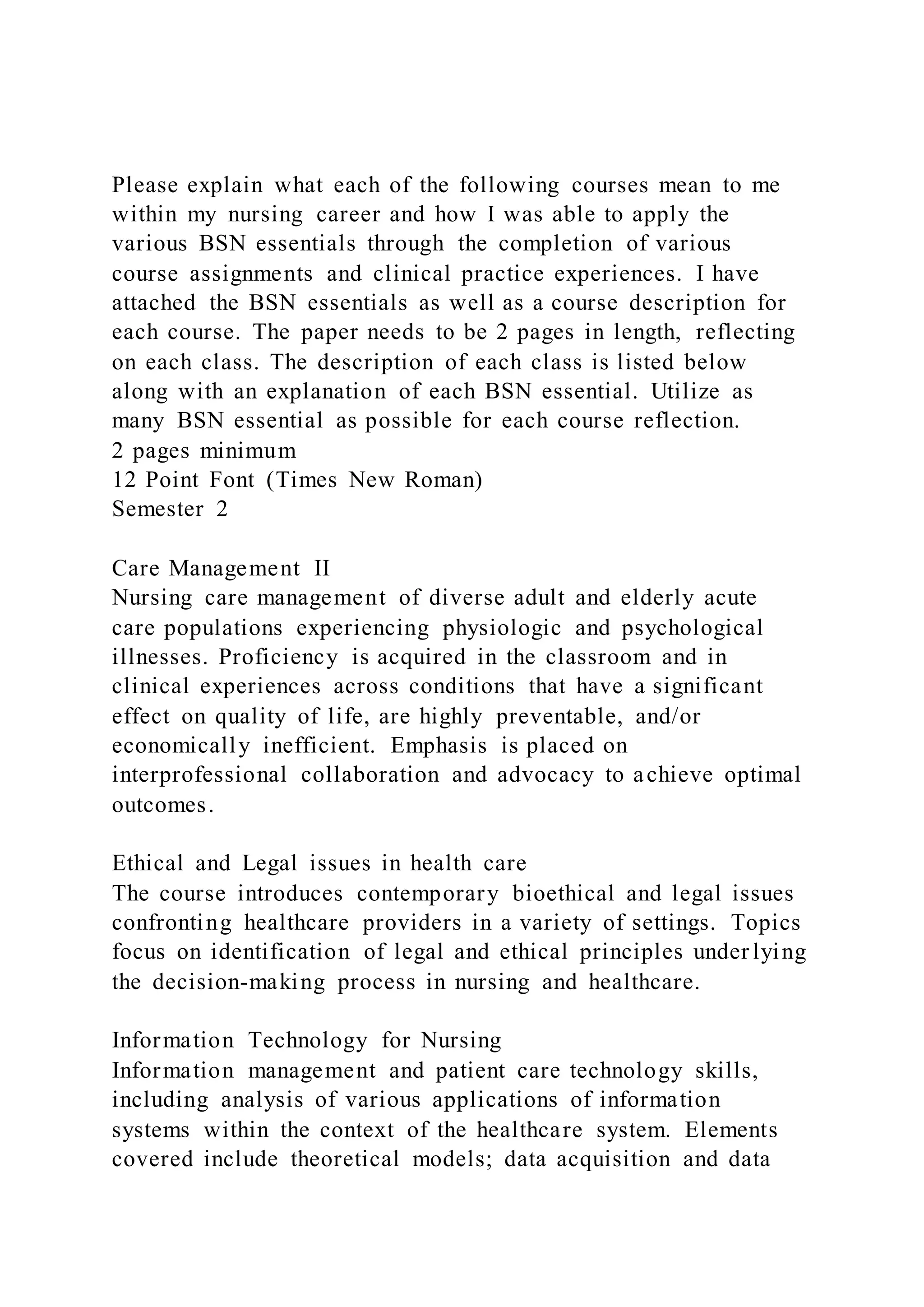 The document outlines the requirement to reflect on various nursing courses and their relevance to the BSN essentials throughout the nursing career. It emphasizes understanding course content related to care management, ethical and legal issues, information technology, and pharmacotherapeutics, while applying key BSN essentials to enhance nursing practice. The reflection must encompass a comprehensive analysis of how these elements integrate to foster professional development in nursing.