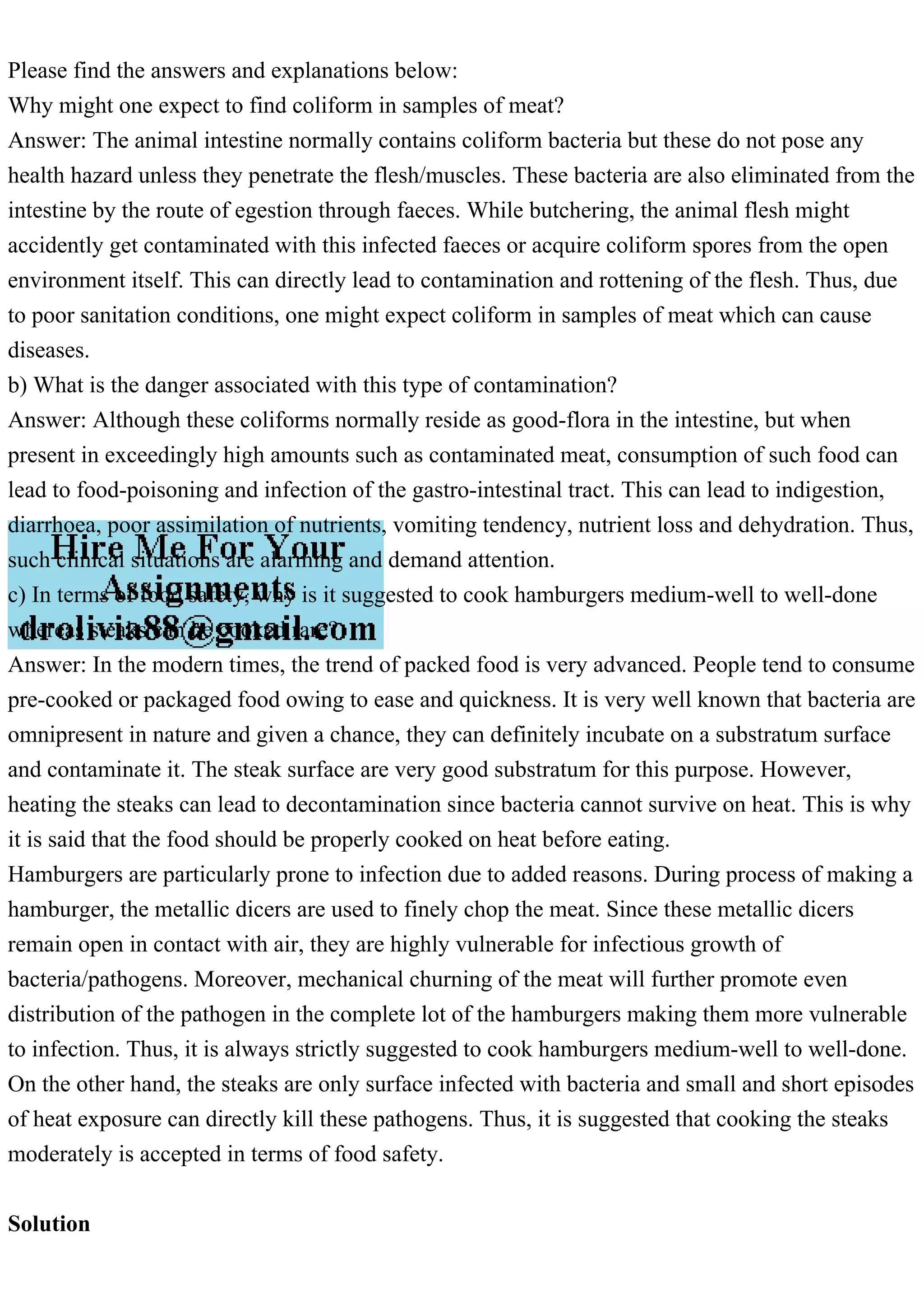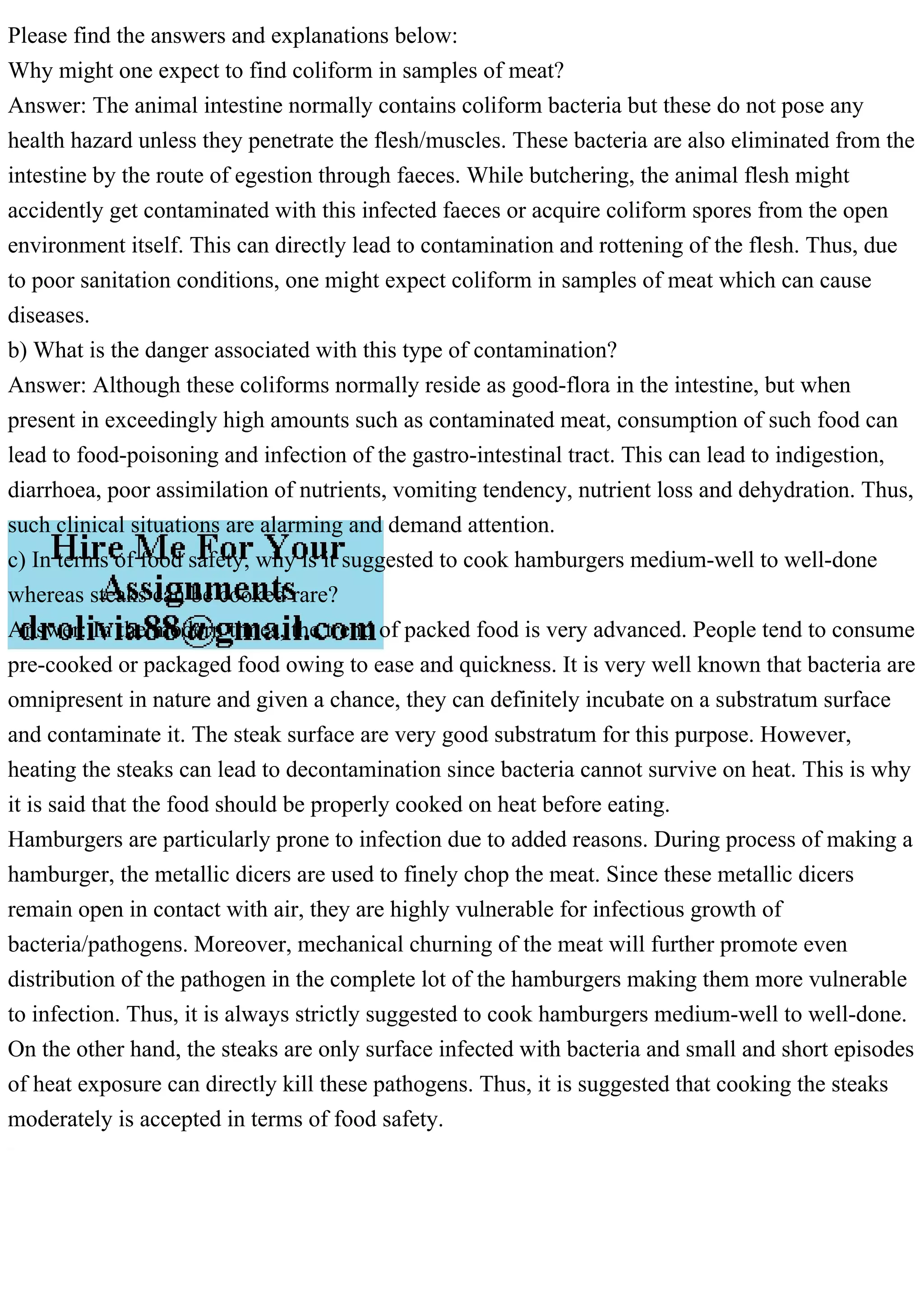 Coliform bacteria are commonly found in animal intestines and can contaminate meat during butchering, leading to potential health hazards if consumed. Such contamination can result in food poisoning and gastrointestinal infections, necessitating proper cooking practices for food safety. Hamburgers require thorough cooking to eliminate pathogens due to contamination during preparation, while steaks only need surface cooking since bacteria are primarily on the outside.