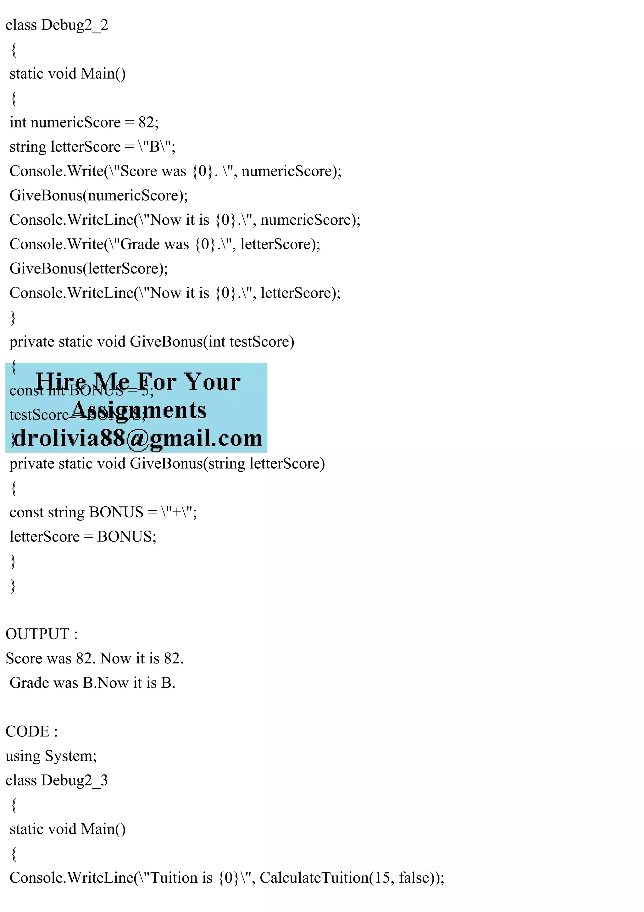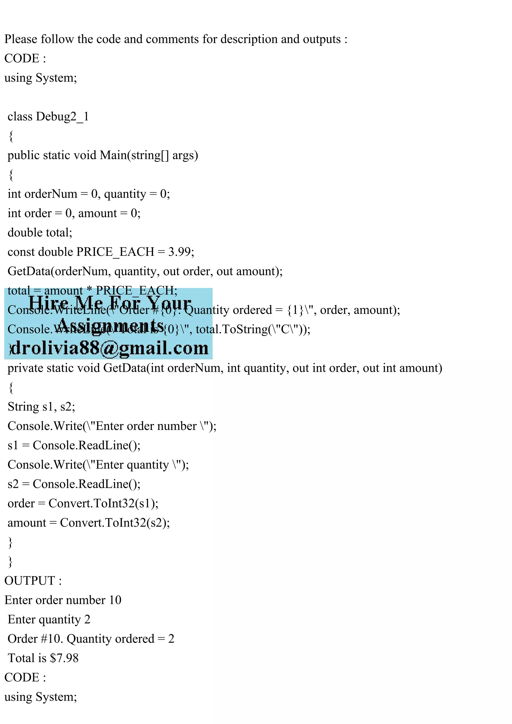 The document contains multiple code samples written in C# that demonstrate various programming concepts, including handling user input, calculating totals, managing different types of scores, and working with arrays. It illustrates user interactions like entering order numbers, computing tuition costs, displaying web addresses, and finding median values for arrays. Each code snippet is followed by its expected output, showcasing the functional behavior of the programs.
