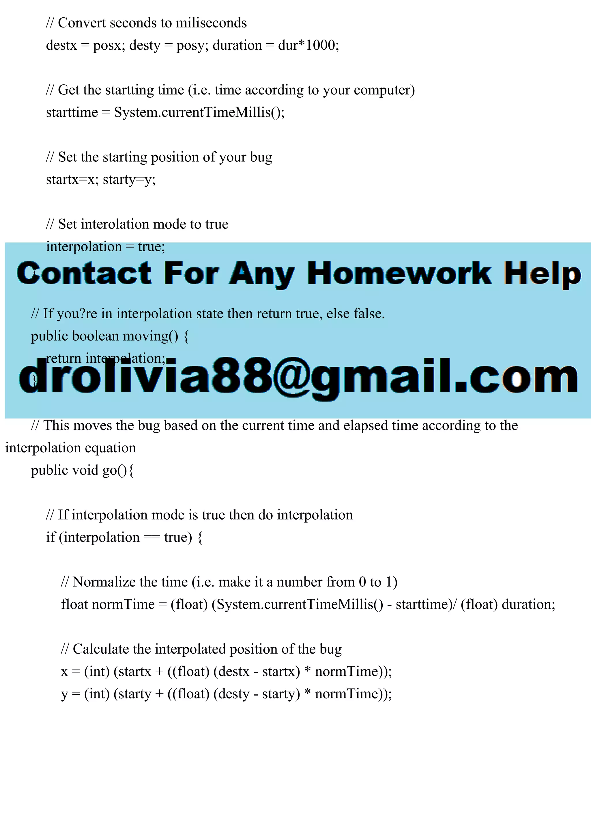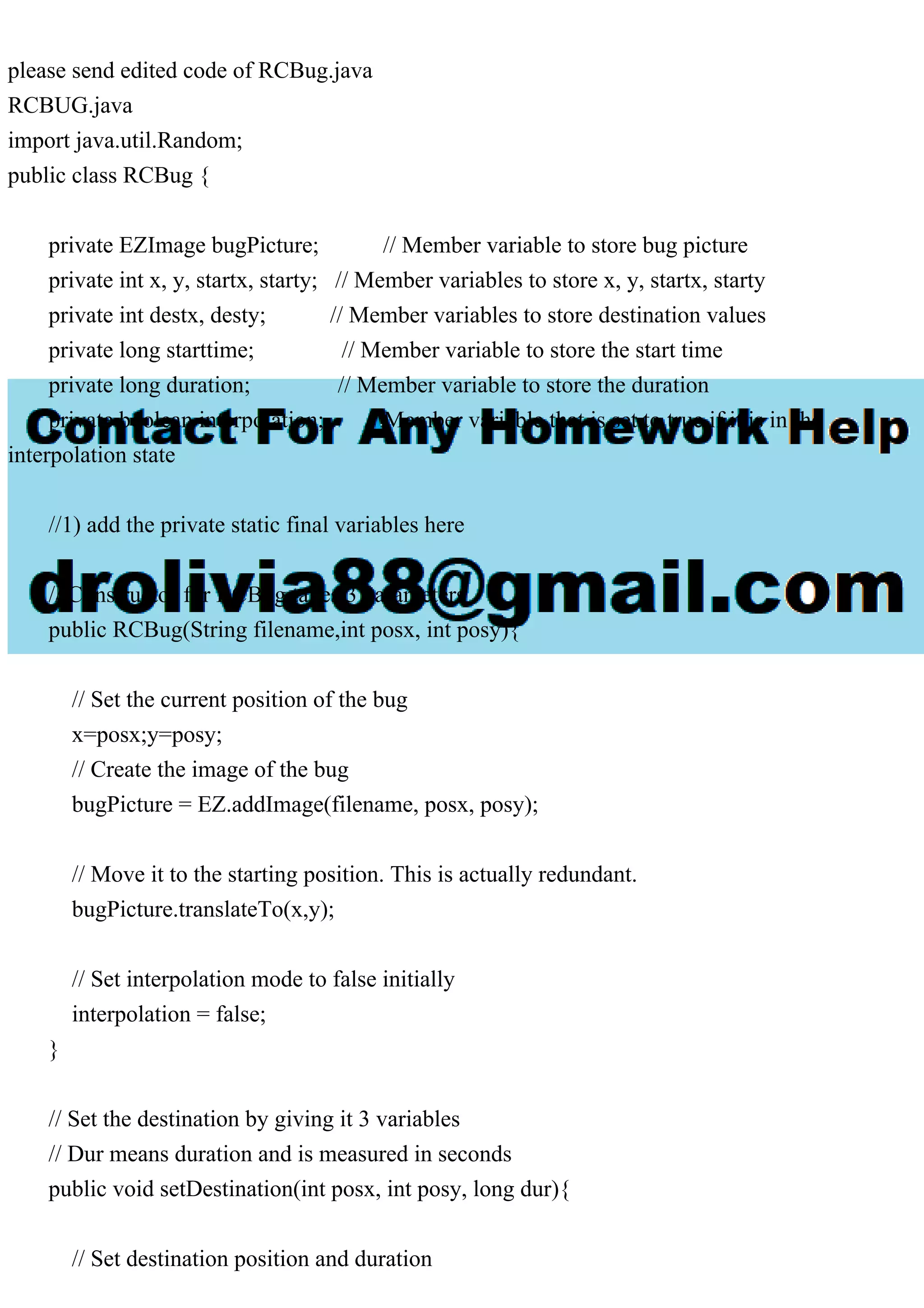 The document presents Java code for two classes, rcbug and rcbugmain, managing a graphical bug animation. The rcbug class handles the bug's movement and interpolation based on user-defined destinations, while rcbugmain facilitates user input to control the bug's actions. An observation is included detailing the impact of a 'spread' variable on the speed of the bug's movements.