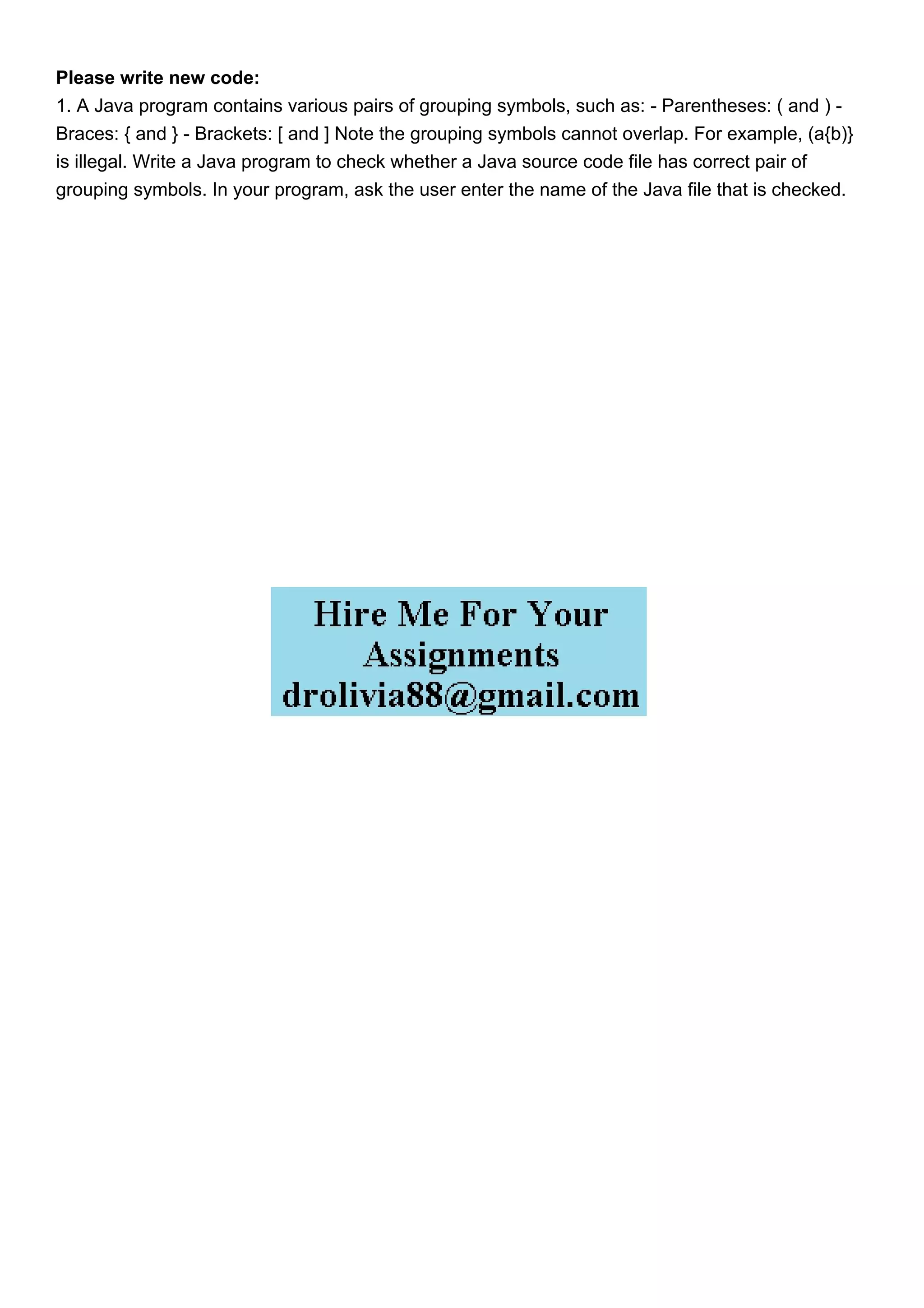 The document outlines a request to write a Java program that checks for correct pairing of grouping symbols such as parentheses, braces, and brackets in a Java source code file. It specifies that overlapping symbols are illegal and instructs the program to prompt the user for the name of the Java file to be checked.