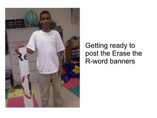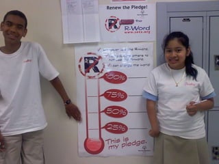 The document discusses posting banners to promote eliminating hurtful language, renewing an anti-bullying pledge for second grade students, and having the students sign their names to signify their commitment.