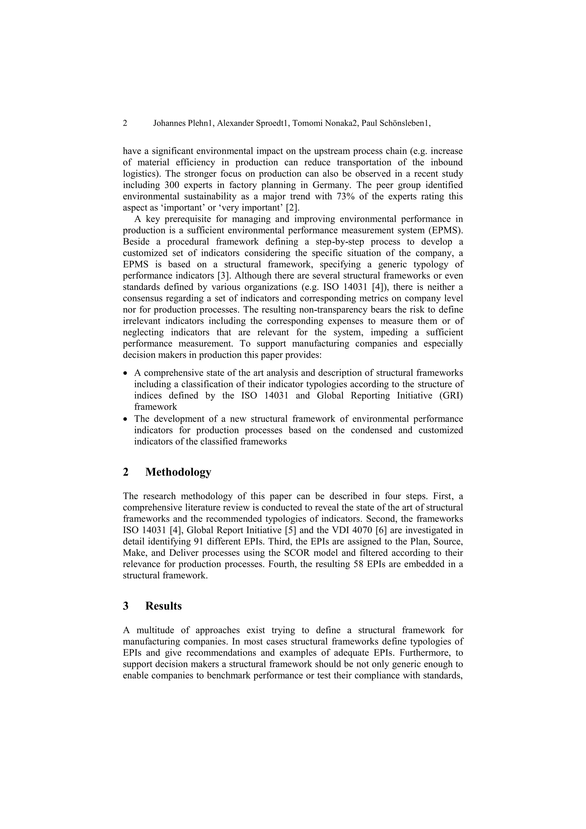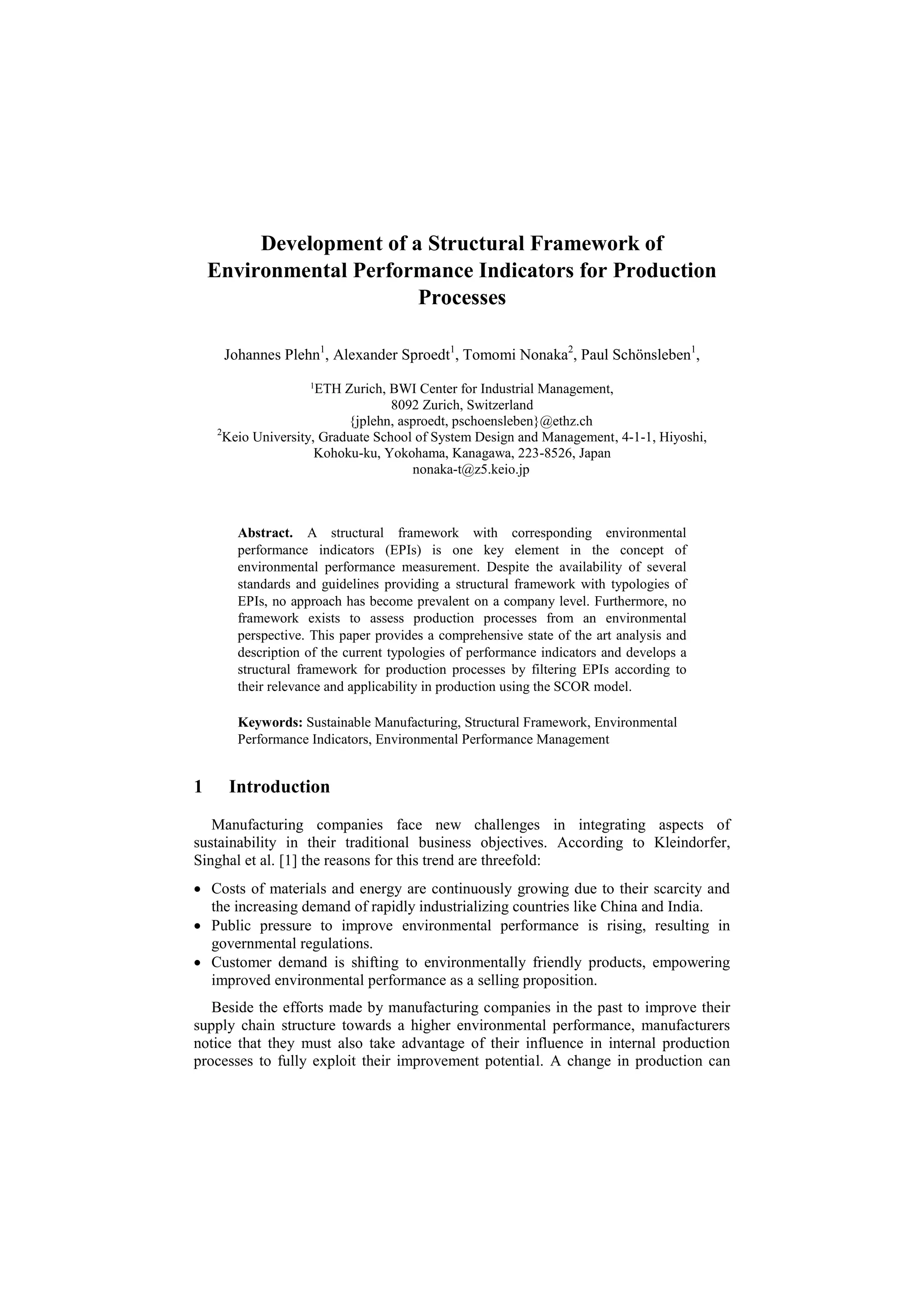 The document presents a structural framework of environmental performance indicators for production processes. It provides a literature review of existing frameworks and their typologies of indicators. It then develops a new framework by filtering 91 identified indicators according to their relevance for production processes based on the SCOR model. The resulting framework includes 58 indicators across 12 indices covering key areas like materials, energy, waste, emissions and their relation to production. It aims to provide a focused set of indicators for assessing environmental performance within manufacturing operations.