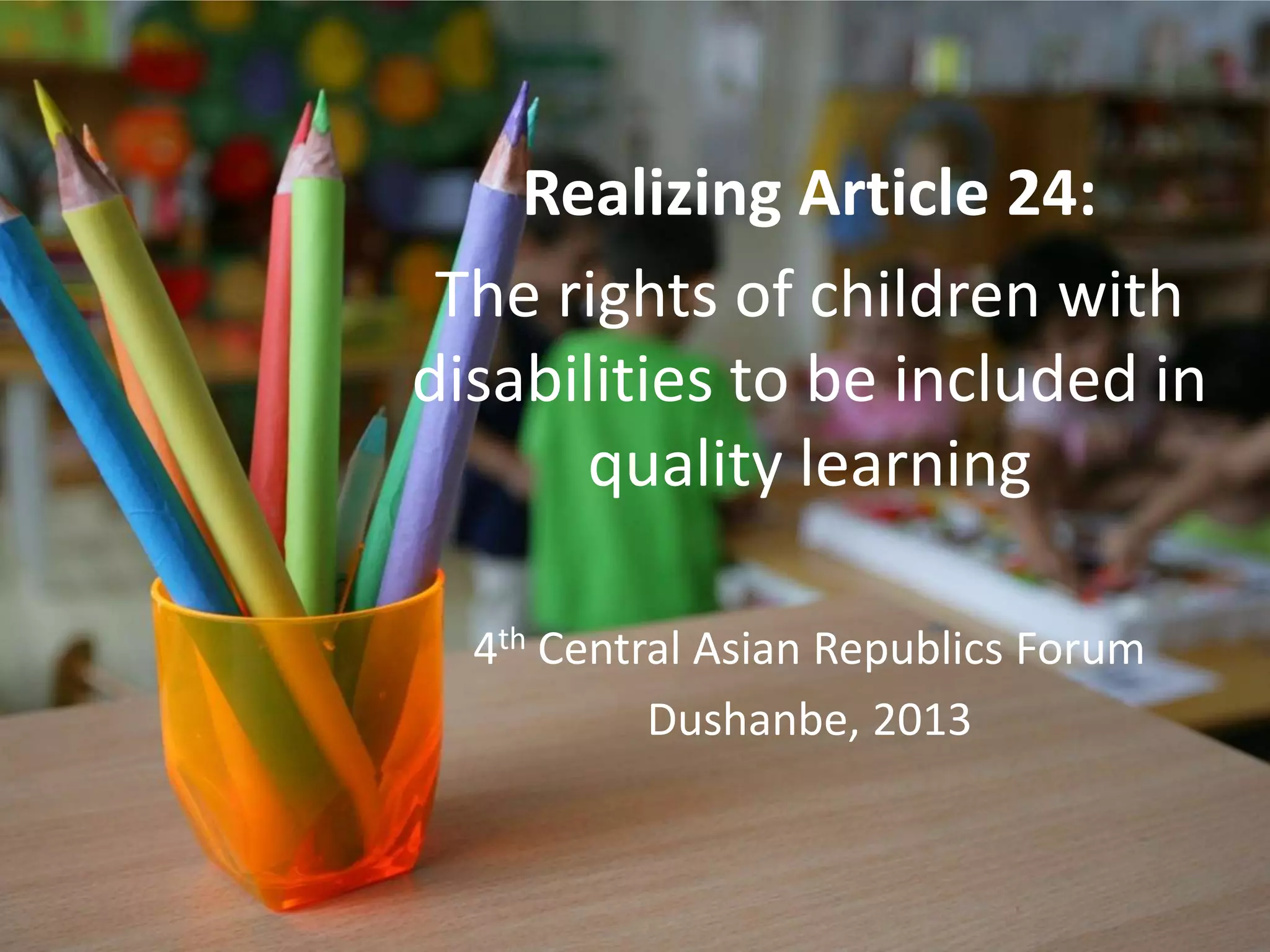 The document discusses the rights of children with disabilities to access quality inclusive education in Central Asia, emphasizing the need for legal reform, de-institutionalization, and a commitment to inclusive education practices. It highlights the importance of removing barriers and ensuring that educational systems respect the identity, culture, and rights of all children, particularly the most marginalized. UNICEF promotes various initiatives aimed at improving educational access and quality for children with disabilities in the region.
