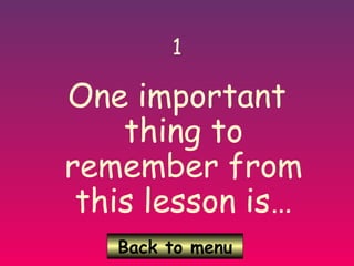 The document outlines key takeaways and reflections from a lesson. It prompts the reader to consider what they learned, areas for improvement, and new knowledge gained. The structure encourages personal reflection on confidence and comprehension related to the lesson.