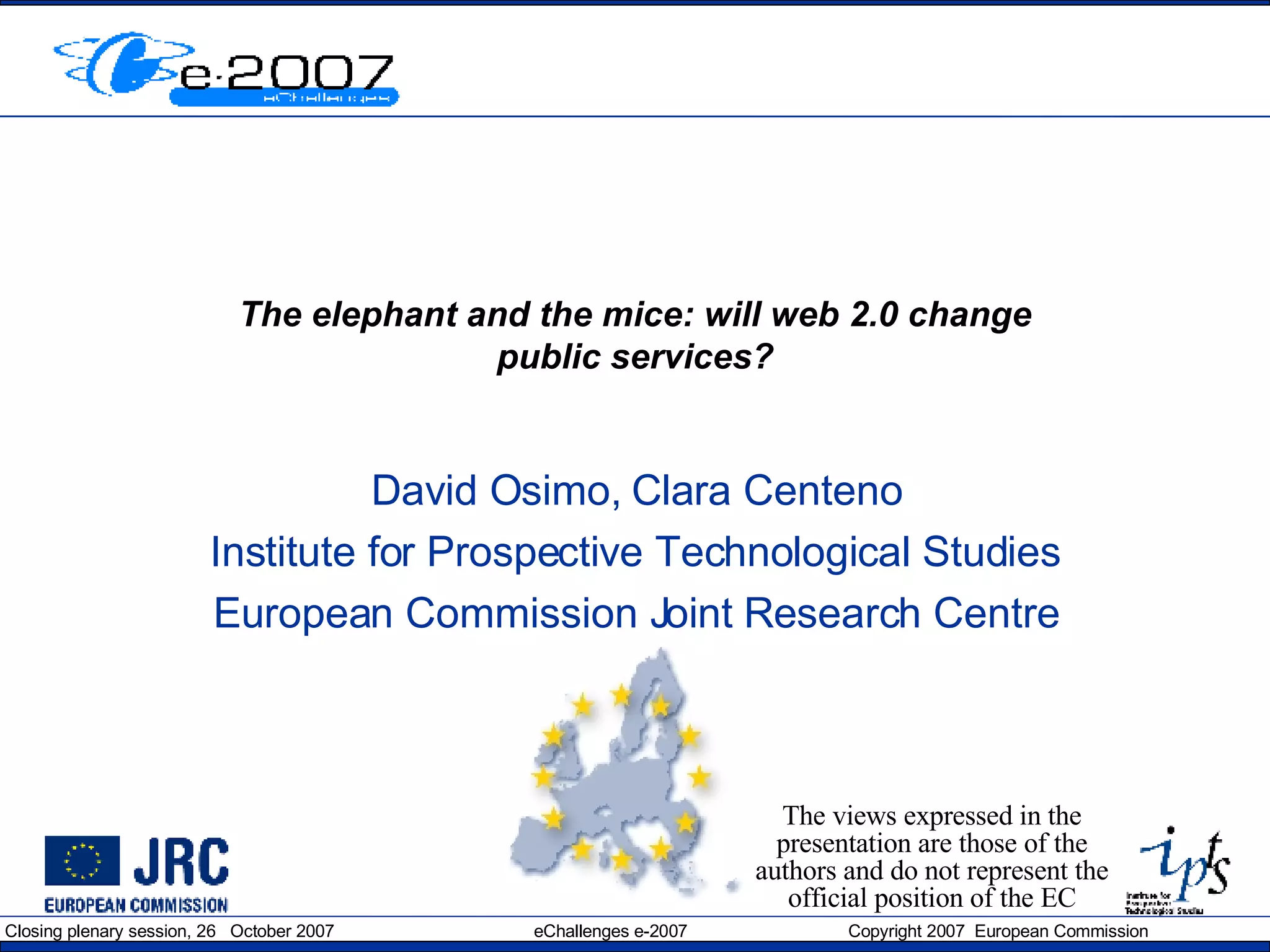 The document discusses the potential impacts of Web 2.0 on public services, highlighting both opportunities and risks. It presents positive scenarios where Web 2.0 can enhance e-government through citizen engagement and collaboration, while also warning of negative consequences such as inefficiency, loss of credibility, and social fragmentation. The conclusion emphasizes the importance of public trust, experimentation, and learning from real-life cases to navigate these challenges.