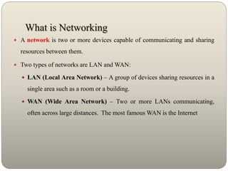 This document provides an overview of the network simulator NS2. It discusses the basics of networking including LANs and WANs. It then describes the history and development of NS1 and NS2. Key aspects of NS2 like its design, workflow and supported routing protocols are explained. Challenges of simulating networks and tips for using NS2 are also provided. The document concludes with references for learning more about NS2.