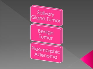 Pleomorphic adenoma is the most common salivary gland tumor, accounting for 60% of cases. It occurs most often in the parotid glands and presents as a painless, firm mass. Histologically, it contains both epithelial and mesenchymal elements arranged in a trabecular pattern within a fibrous stroma. Treatment involves complete surgical removal of the tumor with adequate margins to prevent recurrence due to microscopic projections outside the capsule. Imaging such as CT or MRI is used to identify the location and characteristics of the tumor prior to surgery.
