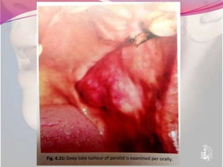 Pleomorphic adenoma is the most common benign tumor of the parotid gland. It consists of both epithelial cells and spindle-shaped mesenchymal cells within an abundant mucoid matrix. On pathology, it displays well-differentiated epithelial cells and spindle/stellate cells in a pleomorphic stroma with mucoid material. The tumor presents as a slow-growing, painless swelling of the parotid gland and is diagnosed by FNAC. The treatment is complete surgical excision via superficial parotidectomy while preserving the facial nerve. Recurrence is possible if there are pseudopods left behind or inadequate margins. Malignant transformation may occur in long-standing tumors.
