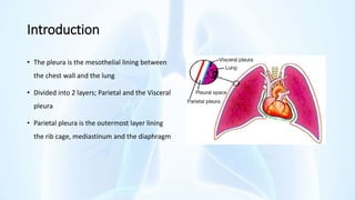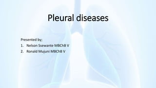 The document provides an overview of pleural diseases, specifically discussing pleurisy, pneumothorax, pleural effusion, empyema, and mesothelioma. It outlines the clinical presentations, diagnostic evaluations, and management strategies for these conditions, highlighting the importance of identifying underlying causes and appropriate treatments. Additionally, it covers the pathology, types, and complications associated with pleural disorders.