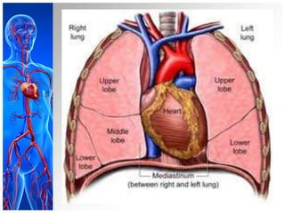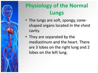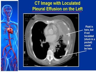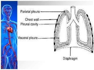 This document provides information on pleural effusions including the physiology of normal lungs, definition of pleural effusion, types of effusions, causes, pathophysiology, clinical manifestations, diagnostic evaluations, treatment, nursing diagnosis and interventions, and possible complications. A pleural effusion is an abnormal collection of fluid in the pleural space between the lungs and chest wall. Effusions can be transudative or exudative depending on the fluid characteristics and underlying cause. Diagnosis involves imaging and fluid analysis. Treatment focuses on removing fluid and treating the underlying cause. Nursing care centers around pain management, breathing exercises, and preventing infections.