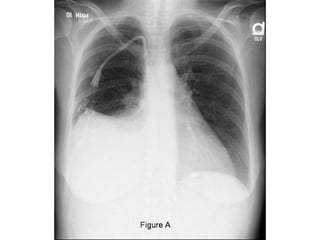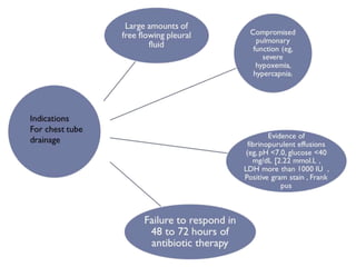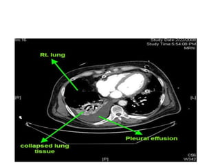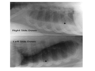 Pleural effusion results from an imbalance between pleural fluid formation and absorption, causing fluid to accumulate in the pleural space. Fluid formation occurs through capillaries in the parietal pleura, and absorption occurs via lymphatic vessels. When the rate of formation exceeds absorption, effusion occurs. Effusions are classified as transudative or exudative based on fluid characteristics. Diagnostic testing of pleural fluid aims to determine the cause of effusion. Radiography and ultrasound are used to identify and characterize pleural fluid.