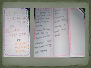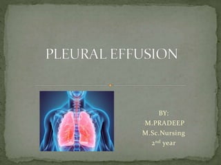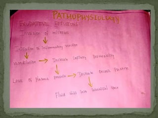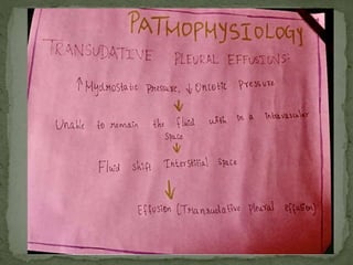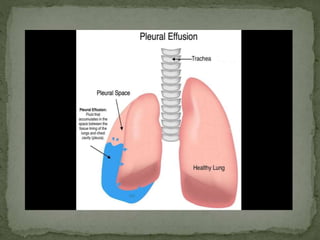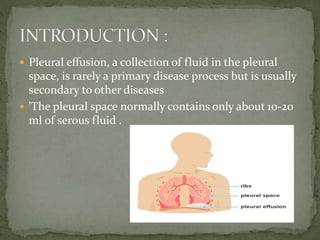Pleural effusion is an abnormal collection of fluid in the pleural space between the lungs and chest wall. It is usually caused by underlying conditions that interfere with fluid drainage from the pleural space. There are two main types of pleural effusions - transudative effusions which contain low-protein fluid seen in conditions like heart failure, and exudative effusions which are high-protein fluids associated with inflammation from sources such as infection or cancer. Diagnosis involves imaging tests and thoracentesis to analyze the fluid. Treatment focuses on resolving the underlying cause, relieving symptoms, and preventing reaccumulation of fluid through procedures like chest tube drainage or pleurodesis.