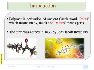 The document discusses poly(lactic-co-glycolic acid) (PLGA), a biodegradable polymer. It provides details on the synthesis of PLGA from lactide and glycolide monomers, its properties such as solubility and glass transition temperature, and its biodegradation process. Applications of PLGA include drug delivery systems, medical implants, and tissue engineering scaffolds. Case studies show that modifying PLGA with other polymers or peptides can improve drug permeability and distribution in tissues.