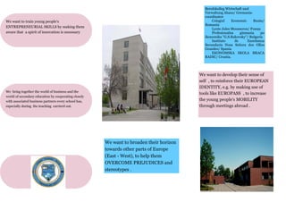 This document discusses a project aimed at helping young people develop skills needed for success in the modern European job market. The project analyzes workplace developments across six European countries and identifies skills like digital competences, language skills, entrepreneurial skills, and intercultural awareness. It also aims to broaden participants' horizons, help them overcome prejudices, and reinforce their European identity. The overall goal is to enhance students' chances of successful job applications within and beyond the EU.