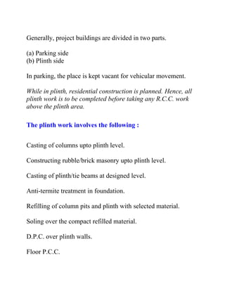 This document provides a checklist and procedures for plinth beam work in building construction. It describes what a plinth beam is and its importance, as all dimensions and offsets are finalized at this stage. Mistakes made at the plinth level cannot be rectified later. The document outlines the process for casting columns up to the plinth level, constructing masonry up to plinth level, and casting plinth/tie beams. It provides guidance on casting and checking plinth tie beams, including ensuring the proper level and use of shuttering.