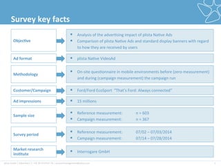 The document presents a market research survey conducted by plista GmbH analyzing the advertising impact of native video ads for the Ford EcoSport. Findings indicate a 41% increase in brand awareness, a 45% increase in purchase intention, and that nearly 50% of respondents favored the native ad format over standard display banners due to less disruption and voluntary consumption. Overall, the survey concludes that plista native ads significantly enhance brand perception and consumer engagement.