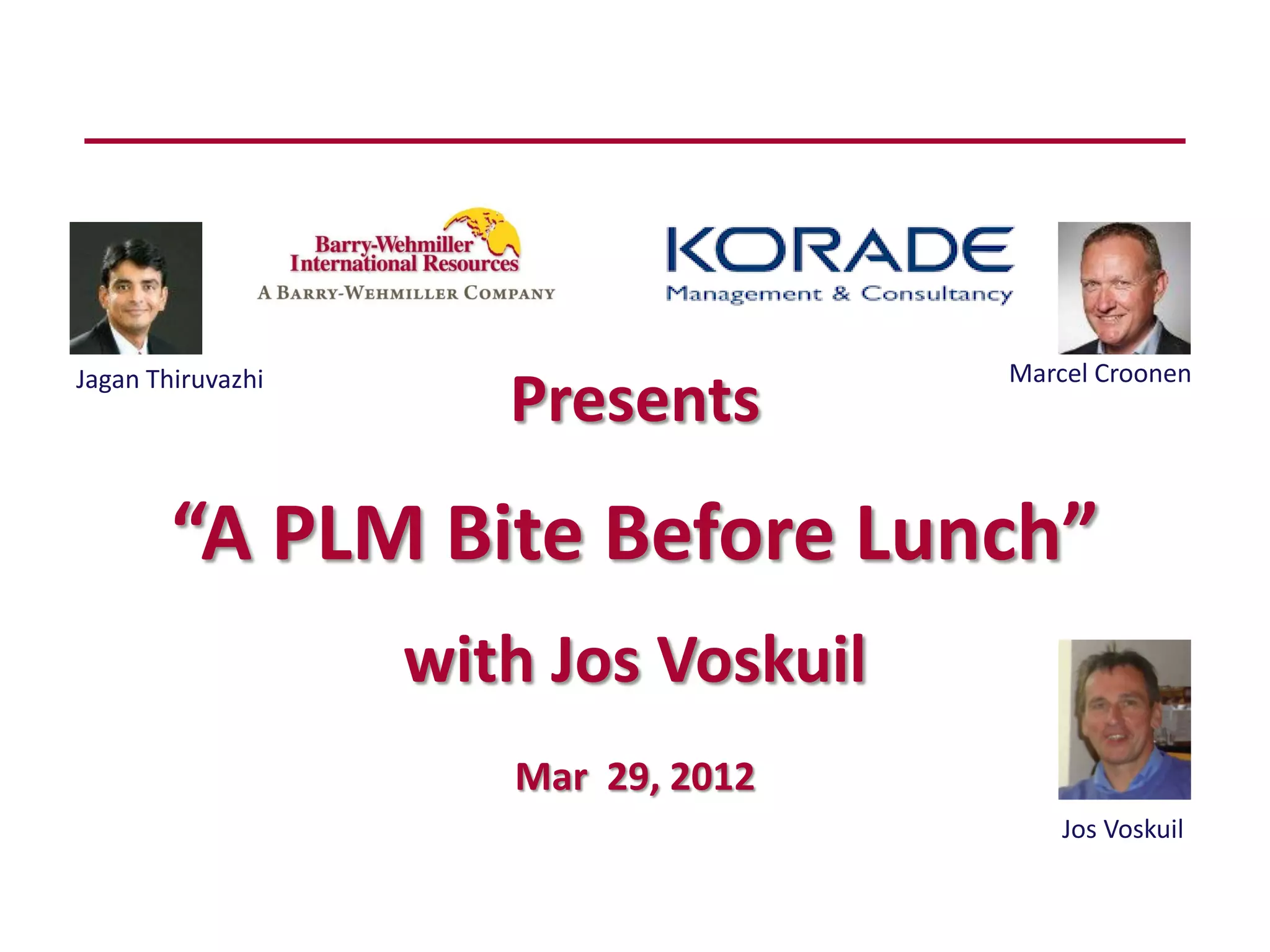 The document presents a presentation by Marcel Croonen and Jos Voskuil on Product Lifecycle Management (PLM), addressing its value, characteristics, and the steps needed for successful implementation. Jos Voskuil shares his experiences and insights into PLM's benefits, such as innovation, efficiency, quality, and improved time-to-market, while emphasizing the necessity of executive sponsorship and stakeholder involvement in the process. Additionally, the document briefly describes the BWIR-Korade partnership and its offerings in the context of PLM and ERP solutions.