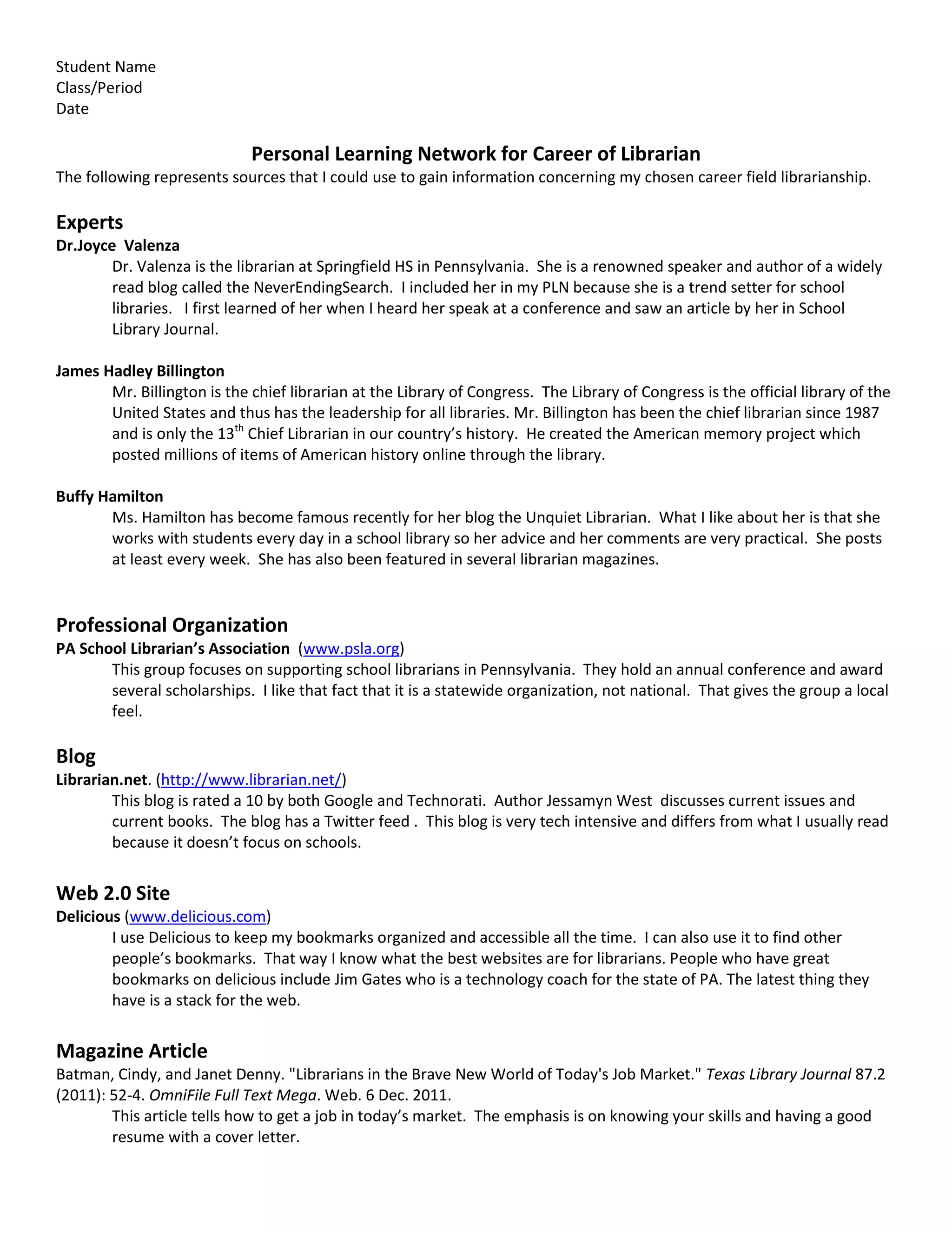 This document outlines sources that a student could use to gain information about pursuing a career as a librarian, including experts in the field, professional organizations, blogs, websites, and magazine articles. The experts mentioned are renowned librarians who could provide guidance. The professional organization is specific to Pennsylvania. The blogs and websites discuss current issues and technologies relevant to librarians. The magazine article provides advice on getting a job as a librarian in today's market.