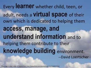 This document discusses using personal learning networks (PLNs) to help students learn. It argues that every learner needs their own virtual space to access and share information. Effective PLNs allow students to inquire, think critically, draw conclusions, and apply knowledge. As students engage in reflective activities and share what they learn back into their networks, they become "amplifiers" who add value by connecting ideas and re-issuing them for others. The document poses the question of how PLNs can benefit students.