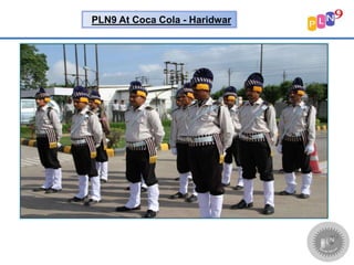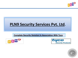PLN9 Security Services Pvt. Ltd provides complete security solutions in association with Tyco for various clients around India including Coca Cola in Haridwar, Amtek in Behror, Jal-Mahal in Jaipur, events on 26 Jan 2013 in Dasna, locations in Nazibabad and Jodhpur, Mawana Marathan near India Gate, PV Askandra in Pokhran, and Adventec Polymers Pvt. Ltd in Behror. The document lists various clients and locations where PLN9 has provided security services with their associate Tyco Security Products.