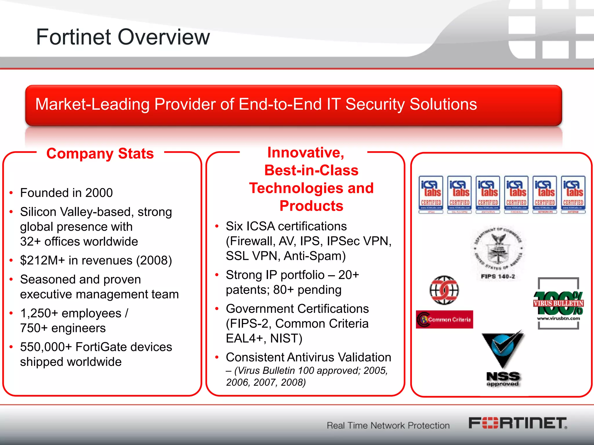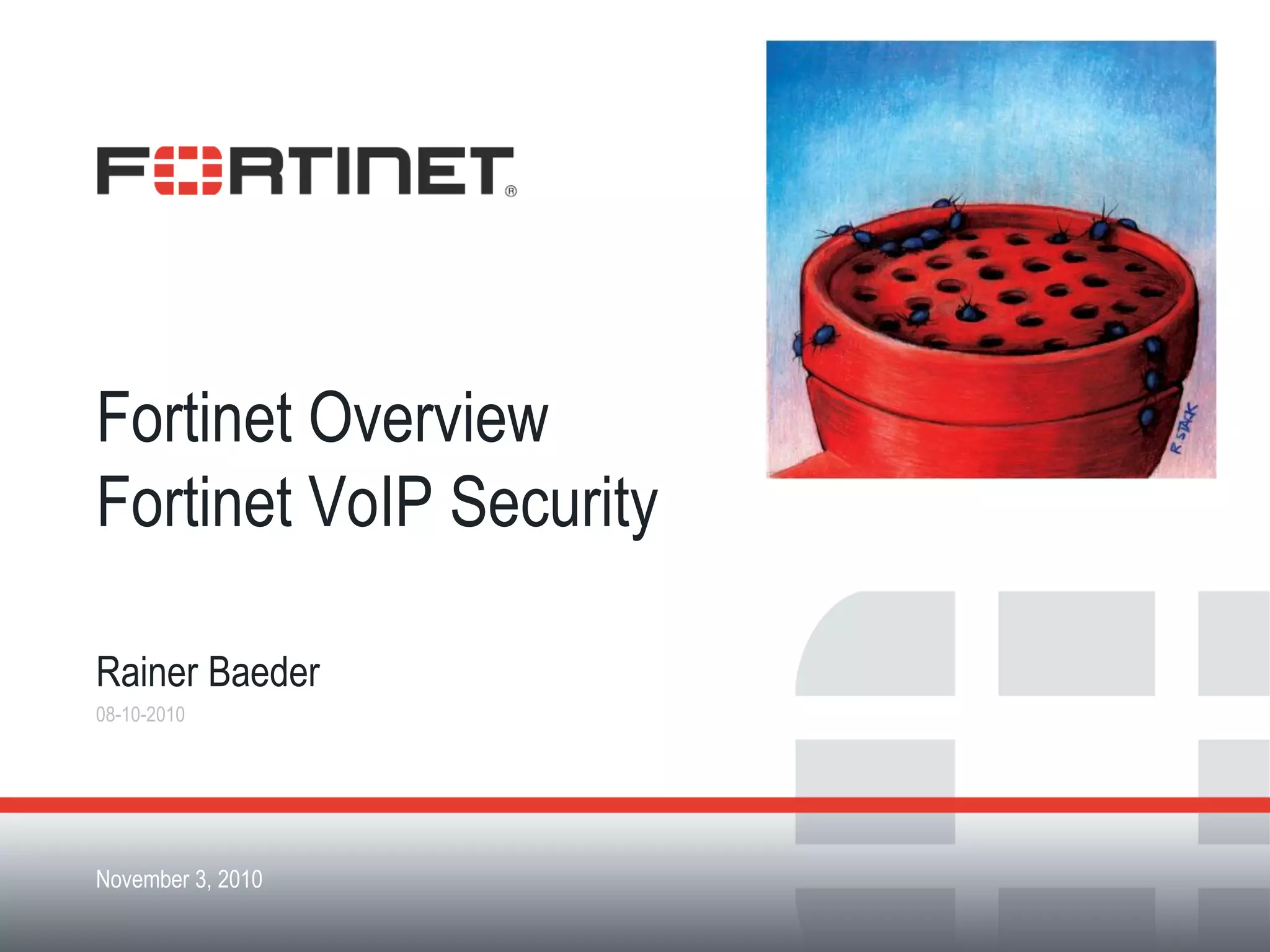 Fortinet is a network security company founded in 2000 with over 1,250 employees. It provides end-to-end security solutions including firewalls, antivirus software, and intrusion prevention systems. The document discusses Fortinet's VoIP security capabilities including SIP protocol inspection, rate limiting, and denial of service protection for VoIP servers. It also covers topics like SIP network address translation, RTP pinholing, media inactivity detection, and load balancing to ensure good VoIP traffic is prioritized over potential denial of service attacks.