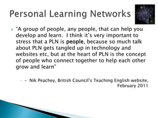 A PLN is a personal learning network comprised of people who connect to help each other grow and learn. Building a PLN requires connecting with like-minded individuals through various tools like Twitter, blogs, and social networking sites for teachers. At the heart of a PLN is connectivism, which views learning as occurring through connections and emphasizes evaluating information to recognize important patterns and draw useful connections over isolated knowledge acquisition.