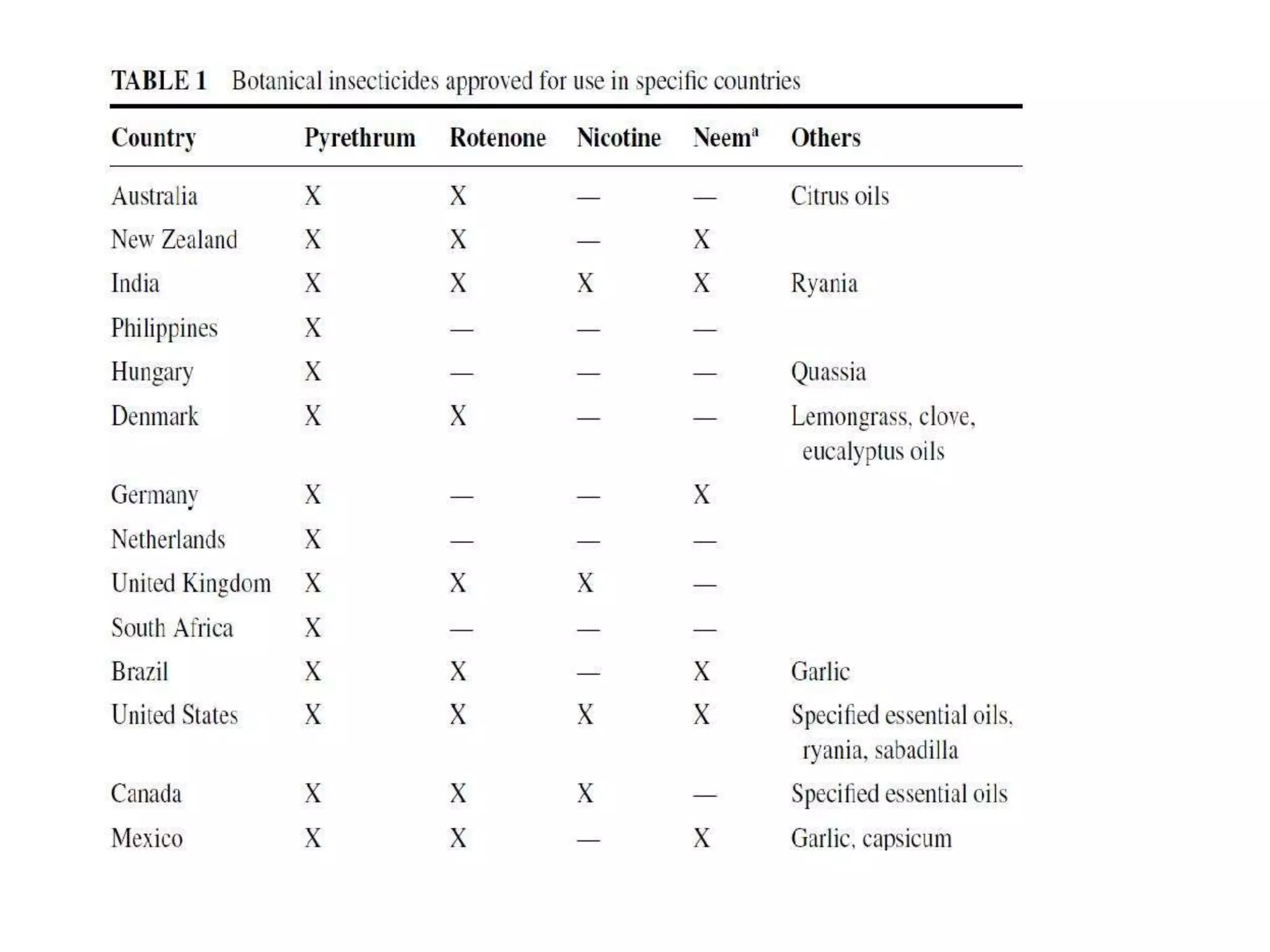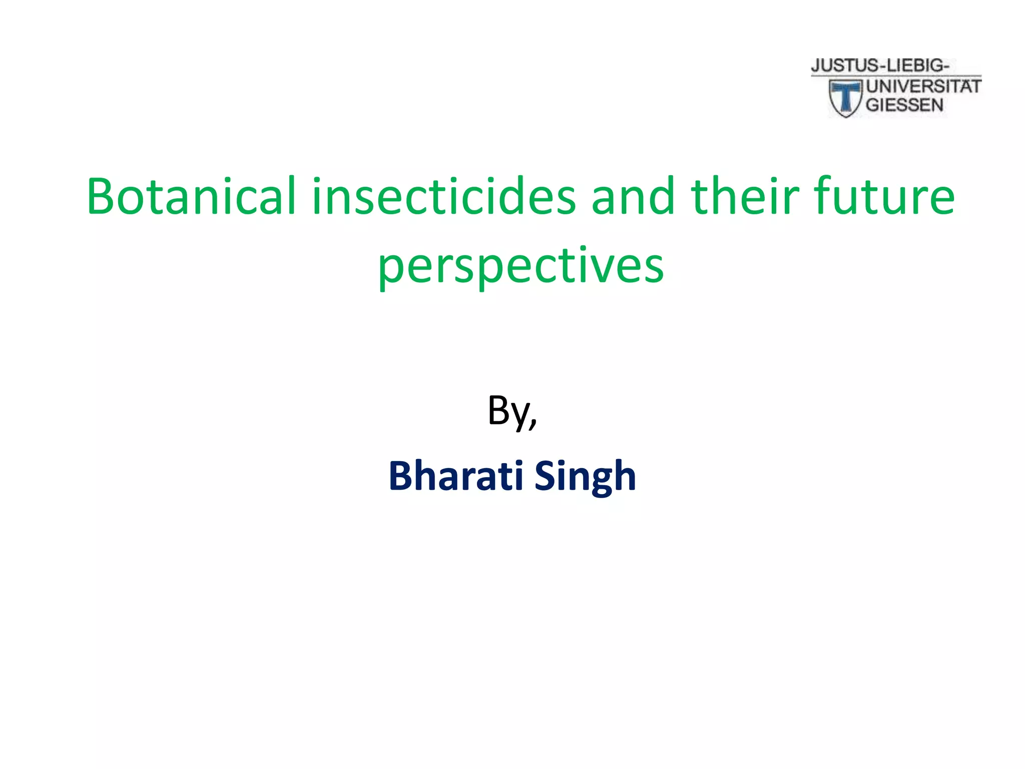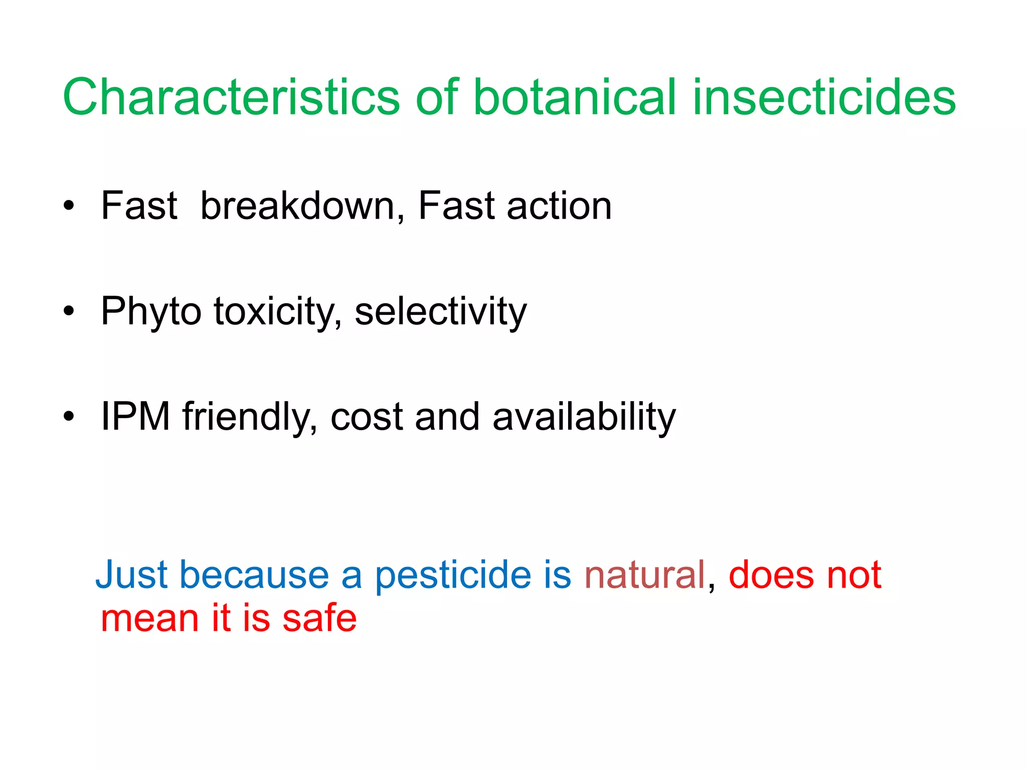 This document discusses several botanical insecticides including their characteristics, extraction methods, target pests, and modes of action. Limonene and linalool are extracted from citrus fruits and act as nerve toxins or stomach poisons. Rotenone is isolated from tropical legumes and inhibits electron transport chains in mitochondria. Sabadilla contains alkaloids that affect sodium channels. Ryania contains alkaloids that are stomach poisons or block the neuromuscular junction. While botanical insecticides were widely used in the past, commercialization faces barriers like scarce natural resources and regulatory approval. The future of botanical insecticides lies in overcoming these barriers and finding a coexistence with synthetic insecticides.