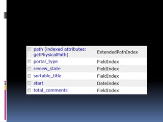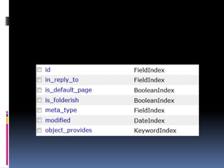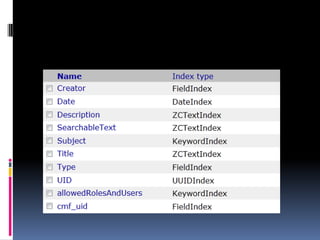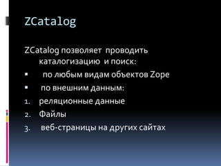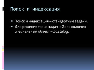 Документ описывает функции поиска и индексации в системе Zope с использованием объекта zcatalog, который позволяет каталогизировать и эффективно искать любые объекты и внешние данные. В нем подробно представлены различные типы индексов, такие как zctextindex, field indexes и keyword indexes, а также встроенные каталоги, доступ к которым осуществляется через программные инструменты. Также рассматриваются методы поиска и извлечения метаданных, включая фильтрацию по времени и атрибутам объектов.