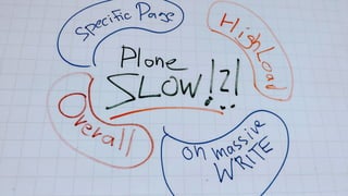 The document discusses performance profiling tools for Python applications, highlighting tools such as py-spy and repoze.profile for analyzing performance issues. It details improvements made in Plone versions 5.2.1 to 5.2.3, including optimizations in caching and memory consumption. Future considerations include optimizing plone.restapi and reducing unnecessary calls to plone.registry.