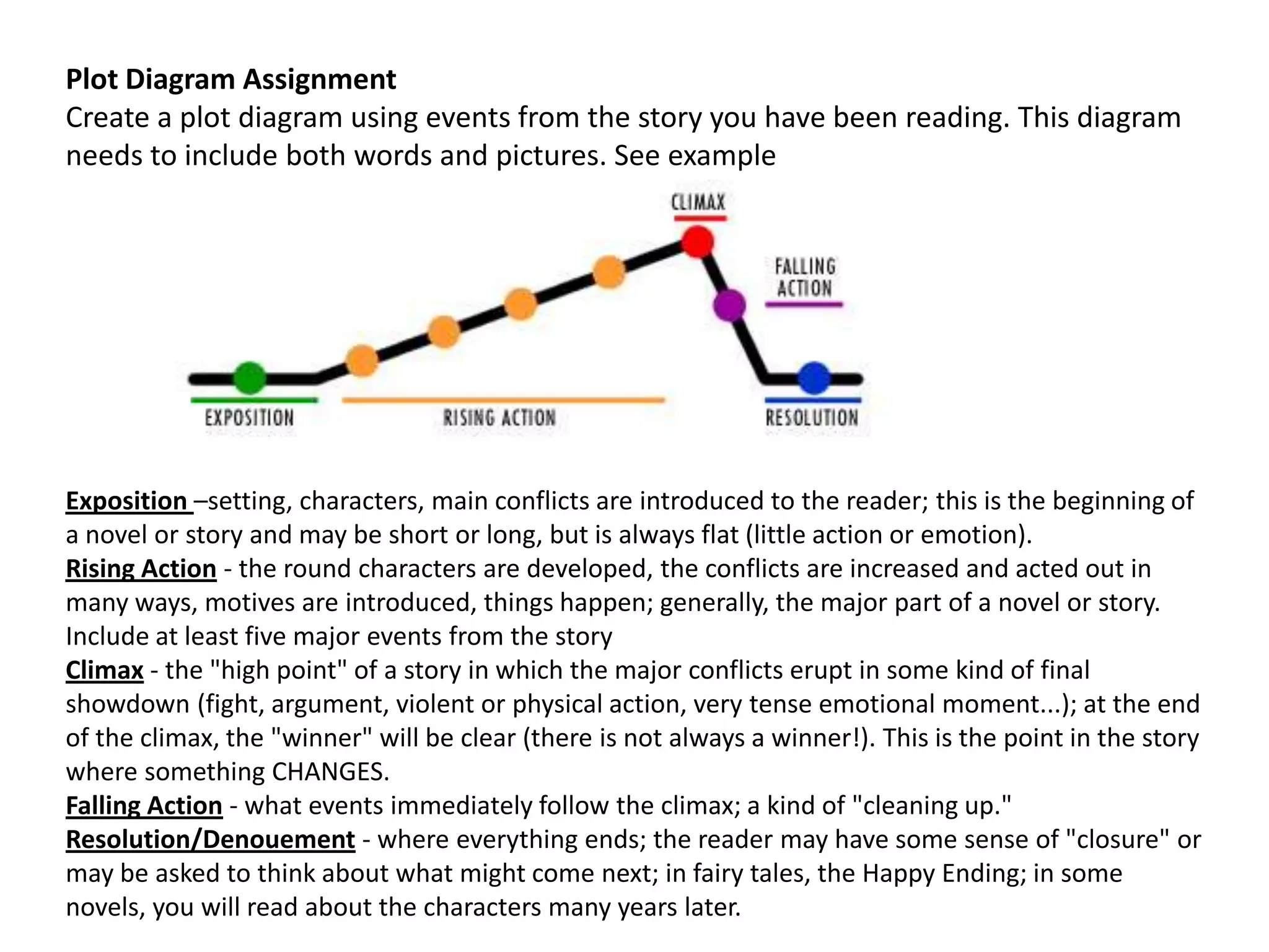 The document provides instructions for creating a plot diagram from a story. It defines the key elements of a plot diagram: exposition, rising action, climax, falling action, and resolution. An example plot diagram is given for the story "The Three Little Pigs" that includes these elements and depicts the major story events in words and pictures.