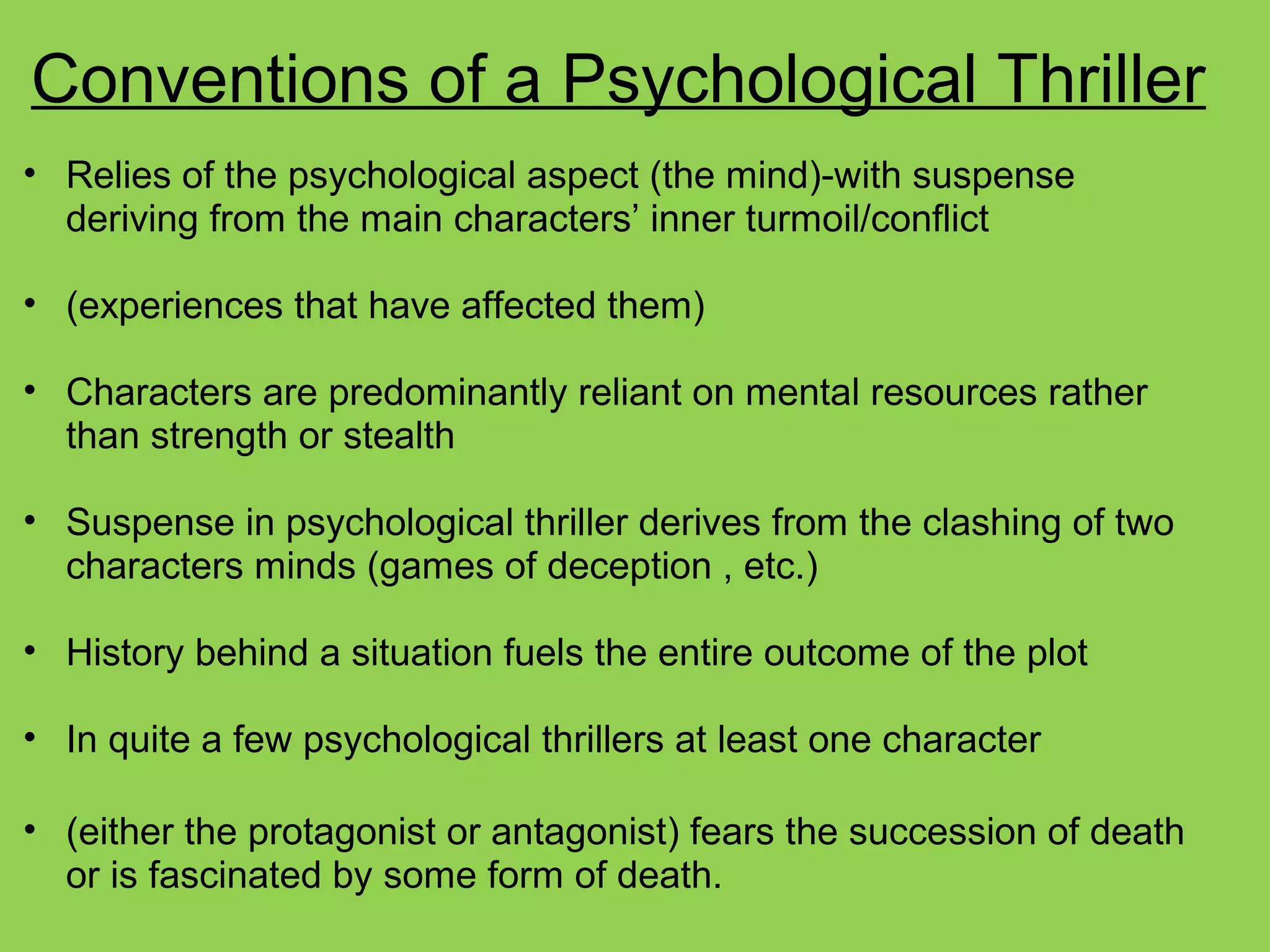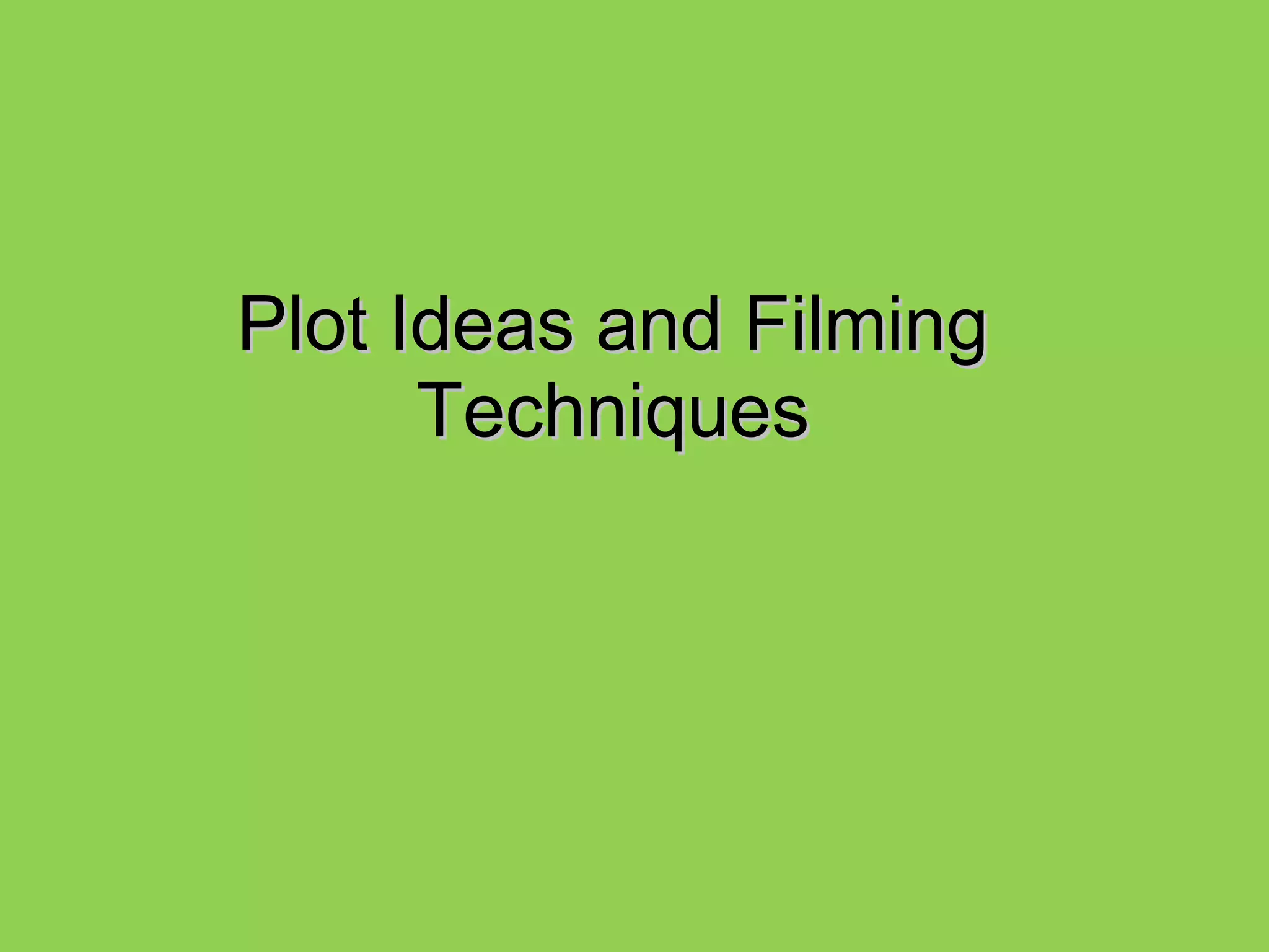 This document outlines ideas and techniques for a psychological thriller film plot and production. The plot would involve a teenage girl who loses her best friend to murder and begins attending therapy. Through this, she meets a boy who is actually the killer with an obsession for long hair. Locations around London with Victorian vibes would be used. Costumes would emphasize the main character's distress and the killer would always be in black. Tight shots and muted colors would build suspense. Sound effects like heavy breathing would add to the thriller elements.