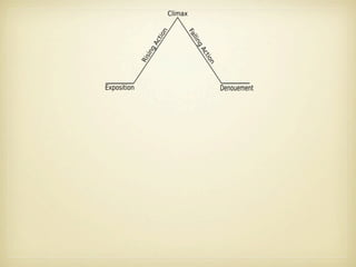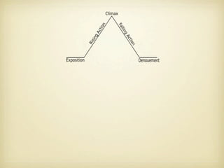 The document provides information about plot structures in stories. It defines plot as the sequence of events in a story and describes typical plot patterns, including an exposition to introduce characters and settings, a rising action with complicating events, a climax of high drama or tension, a falling action as conflicts are resolved, and a dénouement or conclusion. It discusses the use of chronological order, flashbacks, and foreshadowing in storytelling.