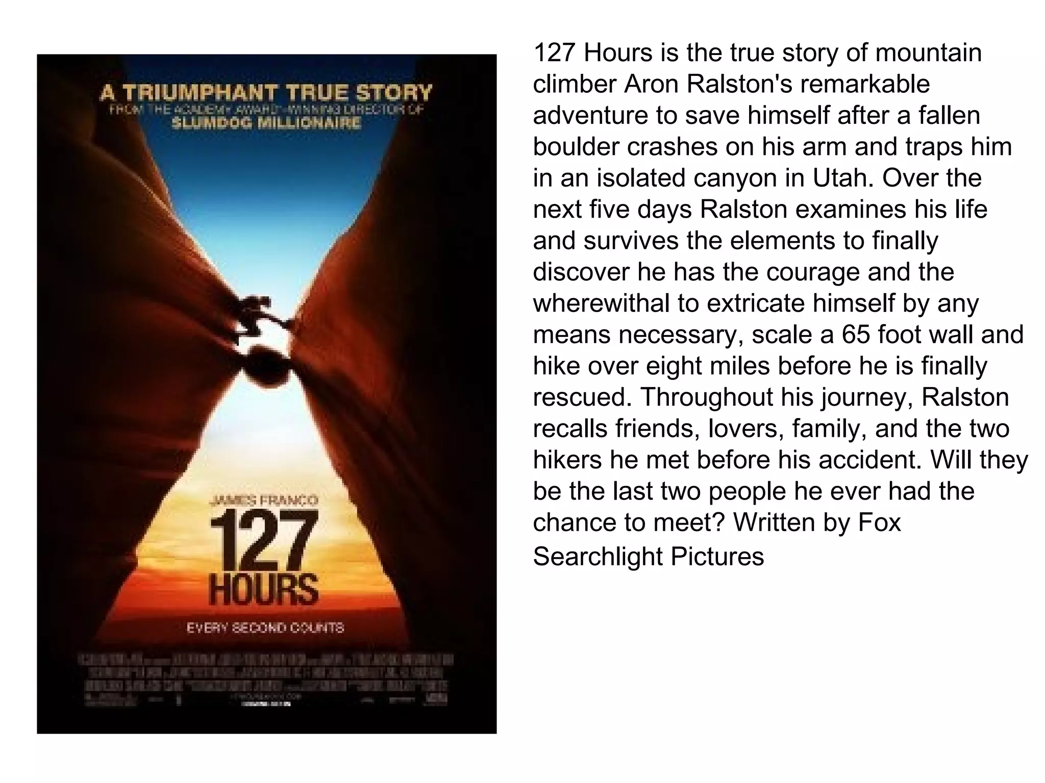 1) 127 Hours tells the true story of Aron Ralston who was trapped by a boulder in a canyon in Utah for 5 days before cutting off his own arm to escape.