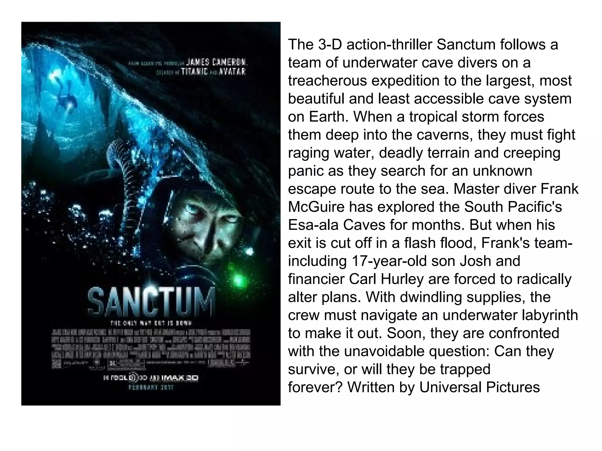 2) Sanctum follows a team of underwater cave divers on a treacherous expedition in Australia's largest cave system who become trapped when a storm hits and must search for an escape route to the sea.