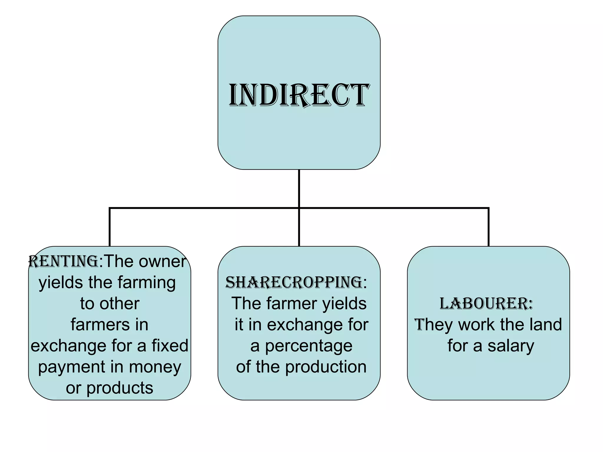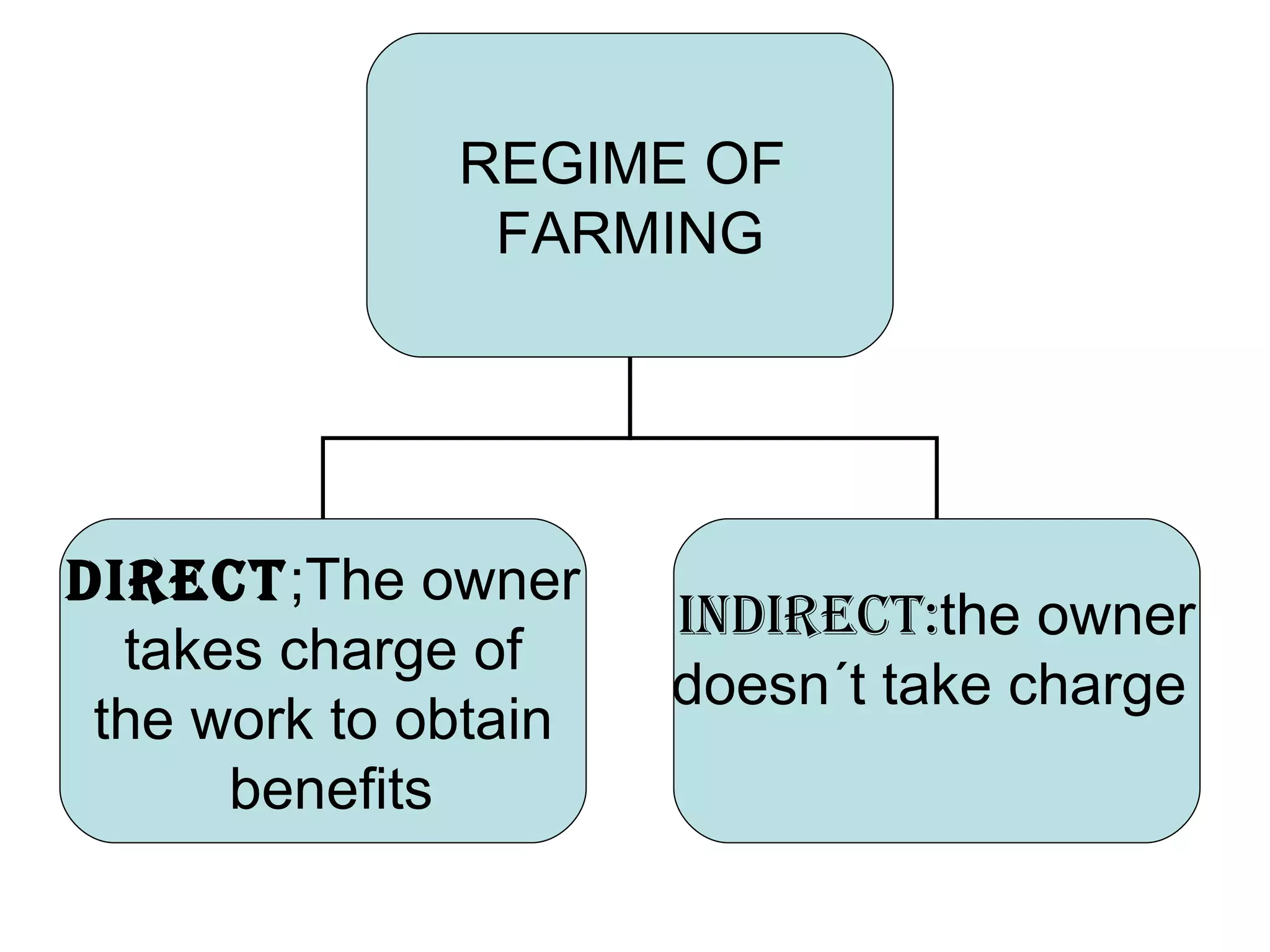 There are several regimes of farming: 1. Direct farming where the owner takes charge of working the land to obtain benefits. 2. Indirect farming where the owner yields the land to other farmers in exchange for fixed payments or products. 3. Sharecropping where the farmer works the land in exchange for a percentage of the production. 4. As a labourer where they work the land for a salary.