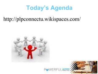 The document outlines an agenda for a meeting to discuss connected learning and professional development in the 21st century. It introduces the community leaders and connected coaches, then discusses how education may change because of the meeting. It defines communities and networks, and discusses professional learning communities, communities of practice, and personal learning networks as approaches to professional development.