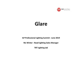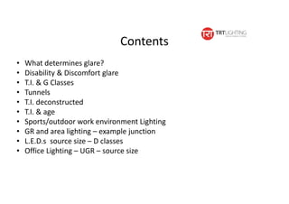 Glare can be caused by disability glare or discomfort glare. Disability glare reduces visibility while discomfort glare causes pain. The Threshold Increment (T.I.) measure quantifies disability glare in road lighting but does not account for discomfort glare or factors like source size. T.I. values should be adjusted upwards for older drivers as glare impacts increase with age. For complex areas like junctions, the Glare Rating (GR) measure may provide a better assessment of disability glare than T.I. or G-classes. Further research is needed on how source size, particularly of LEDs, affects glare.