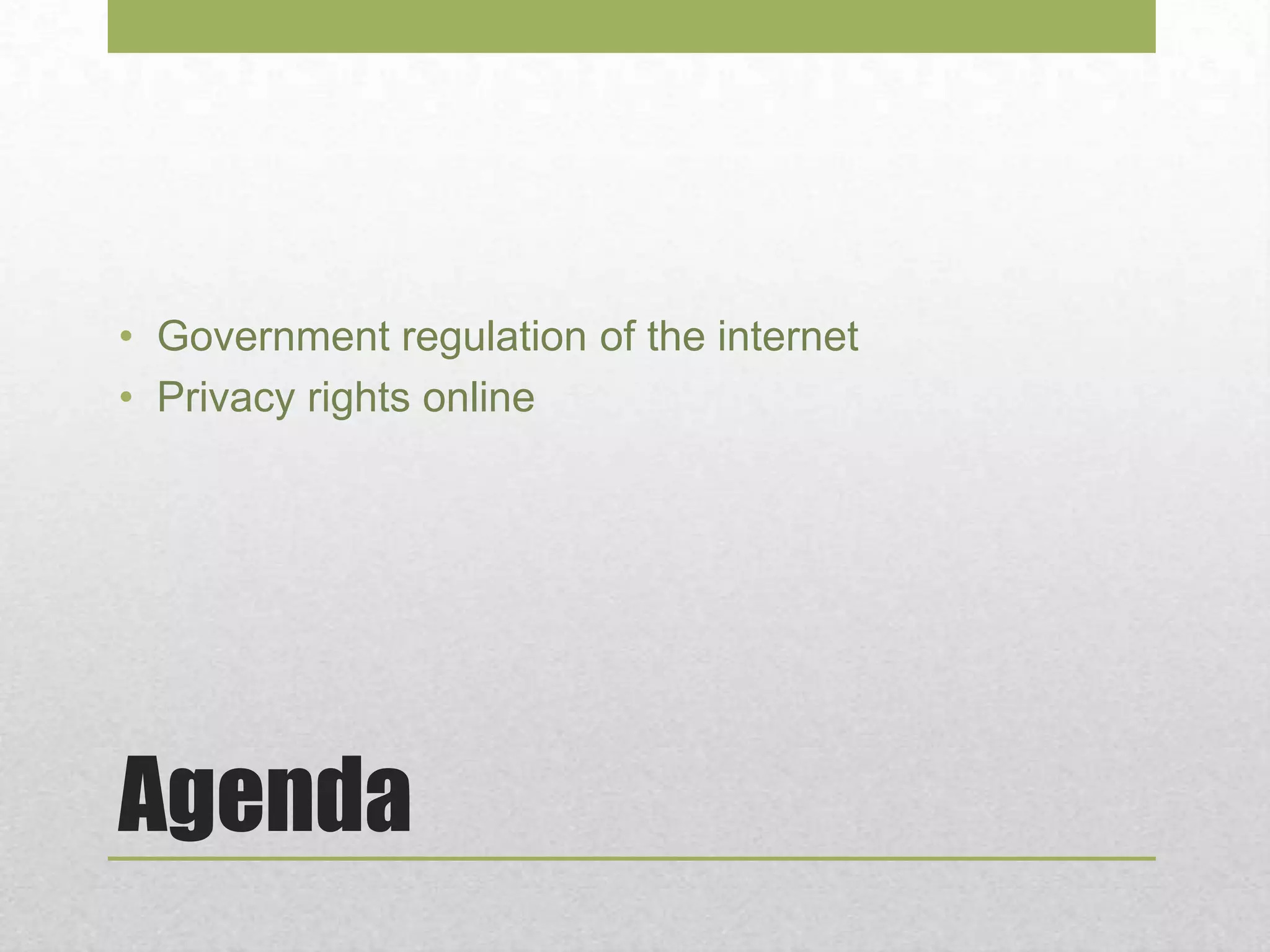 This document provides an agenda and overview for a class on government regulation of the internet. It covers several key topics in internet law and policy, including regulatory methods, antitrust law, net neutrality, privacy, taxation of online commerce, and content regulation. The document outlines important court cases related to each topic and poses discussion questions to consider different policy perspectives on regulating the internet.