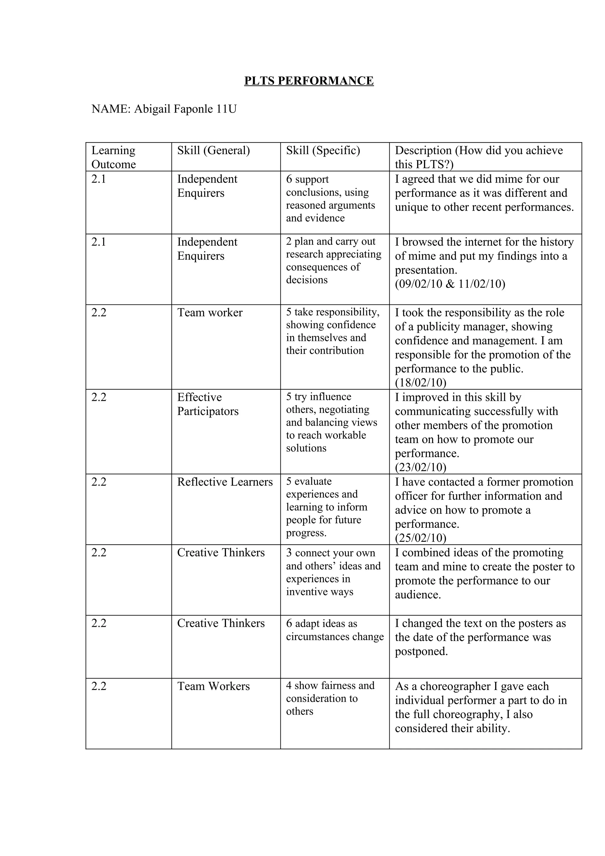 This document summarizes Abigail Faponle's performance in a learning outcome assessment. It describes her skills and achievements in areas like independent inquiry, teamwork, effective participation, creative thinking, self-management, and reflection. For each skill, it provides details of how Abigail demonstrated that skill in planning and promoting a unique mime performance, from researching the history of mime to creating posters, organizing schedules, and inviting feedback to improve.