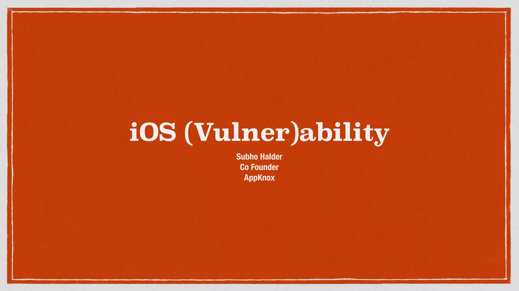 This document discusses security issues and vulnerabilities in the iOS operating system. It begins with an overview of the iOS hardware and software architecture, including the security features like sandboxing and code signing. It then explains what a jailbreak is and how it attacks the chain of trust to bypass these protections. The document outlines several ways sensitive data can be accessed, such as through property lists, SQLite databases, keychains, logs, and cached files. It also discusses client-side vulnerabilities like SQL injection, XSS, and logging of sensitive information. Finally, it promotes learning about mobile security through tools like OWASP iGoat and the speaker's company AppKnox.