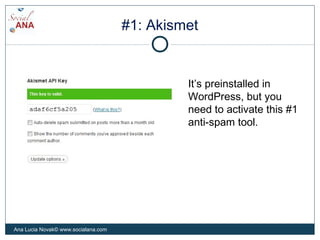 The document lists and describes 10 WordPress plugins for serious bloggers. It recommends Akismet for anti-spam capabilities, All in One Favicon for adding favicons, and All in One SEO for improving SEO. Other recommended plugins include FeedBurner FeedSmith for feed tracking, Simple Google Analytics for stats, PhotoDropper for finding Creative Commons images, WP Super Cache for speed optimization, Add Link to Facebook for social integration, Yet Another Related Posts Plugin for cross-linking posts, and Better WP Security for securing sites. The document promotes scheduling time with the author for social media consulting services.