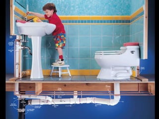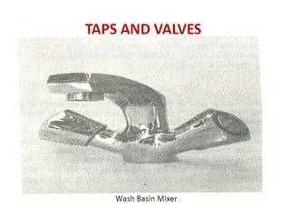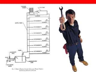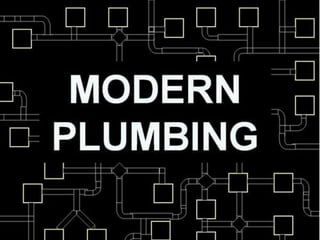 This document provides information about plumbing systems and components. It begins with definitions of plumbing and discusses the history of plumbing from ancient civilizations. It then describes the basic plumbing components found in modern buildings, including water supply pipes, fixtures and traps, soil and waste pipes, and storm drainage. The document provides details on water supply systems, drainage systems, and plumbing fixtures and fittings. It also discusses plumbing codes and regulations from the National Building Code of India. Finally, it includes examples of plumbing system designs for apartments and case studies.