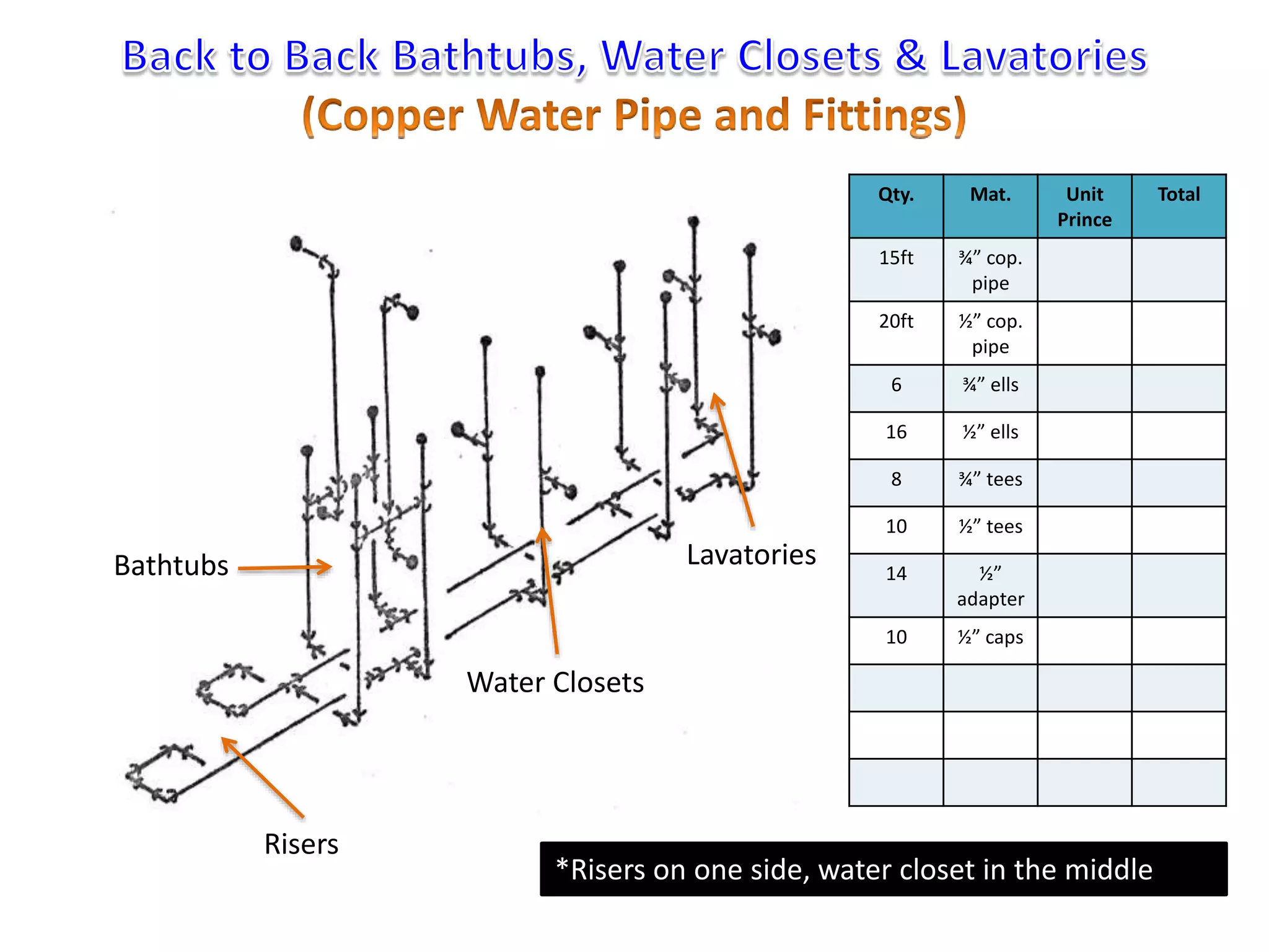 The document provides a detailed list of plumbing materials, including quantities and specifications for various pipes, fittings, and fixtures used in bathroom installations. It outlines measurements for different setups involving bathtubs, water closets, and lavatories. The information appears to be organized by sections corresponding to distinct installation configurations and material types.