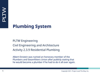 #5 A plumbing system consists of all the elements that provide water or convey water or wastewater within the building as well as those elements that vent the wastewater system. Often gas and stormwater drainpipes are also installed and are considered part of the plumbing system.