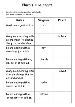 The document provides a chart describing rules for forming plurals in English. It includes rules for nouns ending in consonant+y, vowels+o/ch/sh/x, f/fe, and more. The chart is being completed with missing singulars and plurals and more examples. The goal is to learn how to change singular nouns to their plural forms according to common rules in English.
