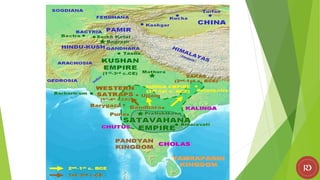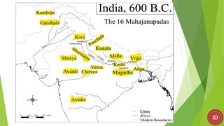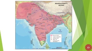 The document outlines the historical progression of ancient India from 600 BCE to 600 CE, highlighting the emergence of agricultural settlements, early states, and significant developments in trade and society. It discusses the rise and fall of various kingdoms, notably the Mauryan Empire under rulers like Chandragupta and Ashoka, and the regional powers that followed. The text emphasizes the role of inscriptions, epigraphy, and the trade networks that connected different regions, showcasing the complexity of political and economic structures during this period.