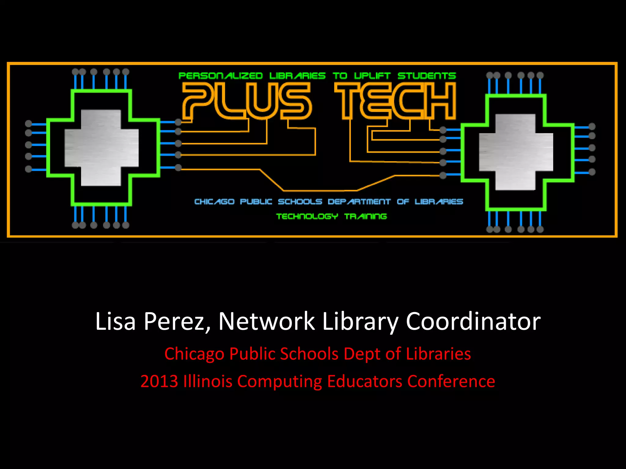 Lisa Perez presented on PLUS Tech, a personalized learning initiative for Chicago Public Schools. PLUS Tech uses gamification elements like digital badges, points systems, and quizzes to provide free and low-cost online professional development for teachers. It aims to make learning fun through vendor partnerships, screencasts, quizzes, and other digital resources while addressing budget and time constraints. Teachers can earn continuing education credits and customize their learning experience through a flexible menu of technology-focused modules and assessments.