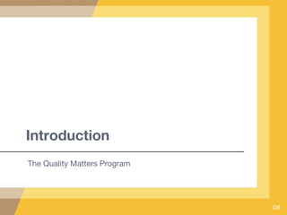 - An overview of the Quality Matters program, which is an online course review program that uses a rubric with 8 standards to evaluate courses.